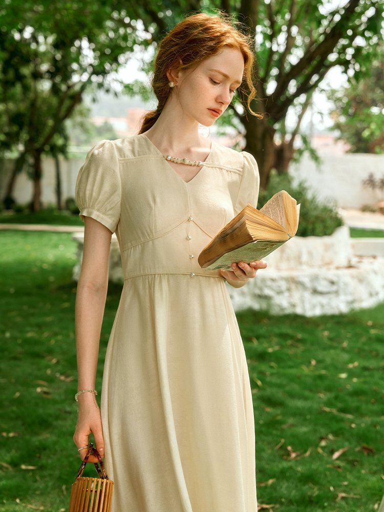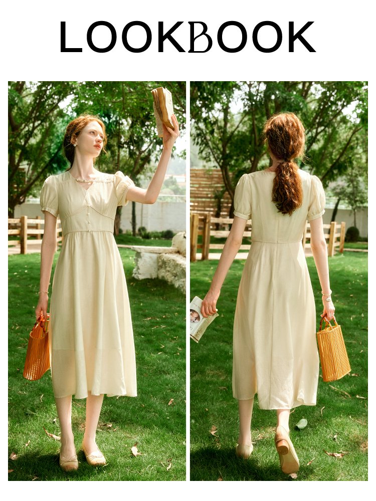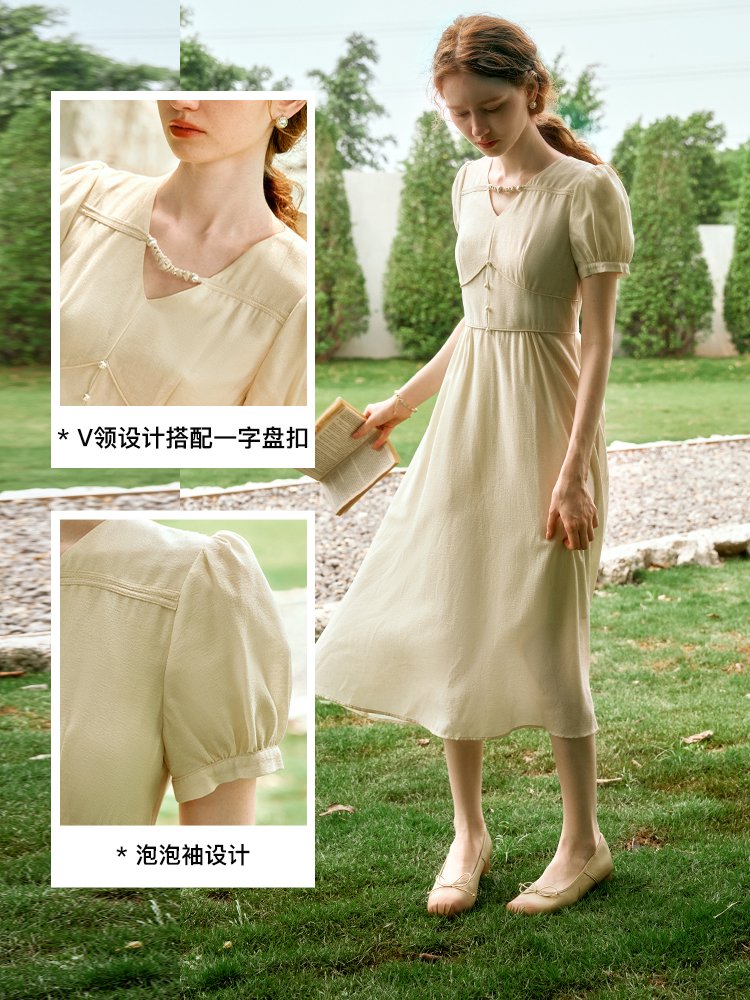 V领搭配一字盘扣,视觉修饰精至锁骨和颈线,泡泡袖设计,立体有型,遮挡手臂拜拜肉,前中珍珠扣点缀,精美优雅吸睛,丰富细节感,高腰线设计轻松显高,A字裙摆遮胯显瘦
