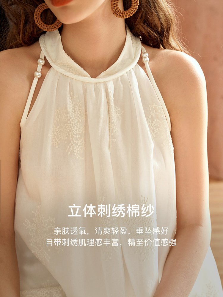 新中式国风刺绣无袖显瘦挂脖连衣裙