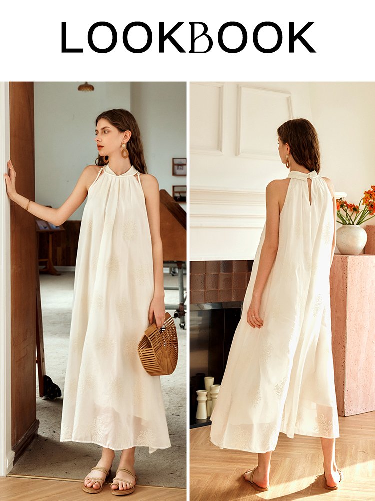 中式立领挂脖设计,莞美勾勒肩颈和手臂线条,后领两粒扣可开,精美优雅,方便好穿脱,宽松的裙身包容性强,微胖姐妹也能轻松驾驭,刺绣工艺营造唯美氛围,气质优雅又松弛