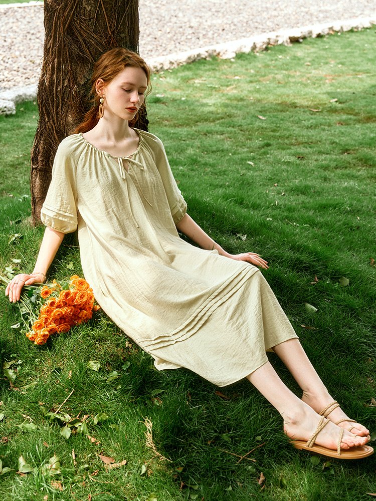 圆领系带+小V领口,甜美减龄,顺势延长颈线,插肩灯笼袖型,透露慵懒松弛感,藏肉有型,袖身及裙摆车褶工艺,丰富细节层次,更立体显瘦,宽松A型,可拆卸腰带可调节宽松度,包容性好