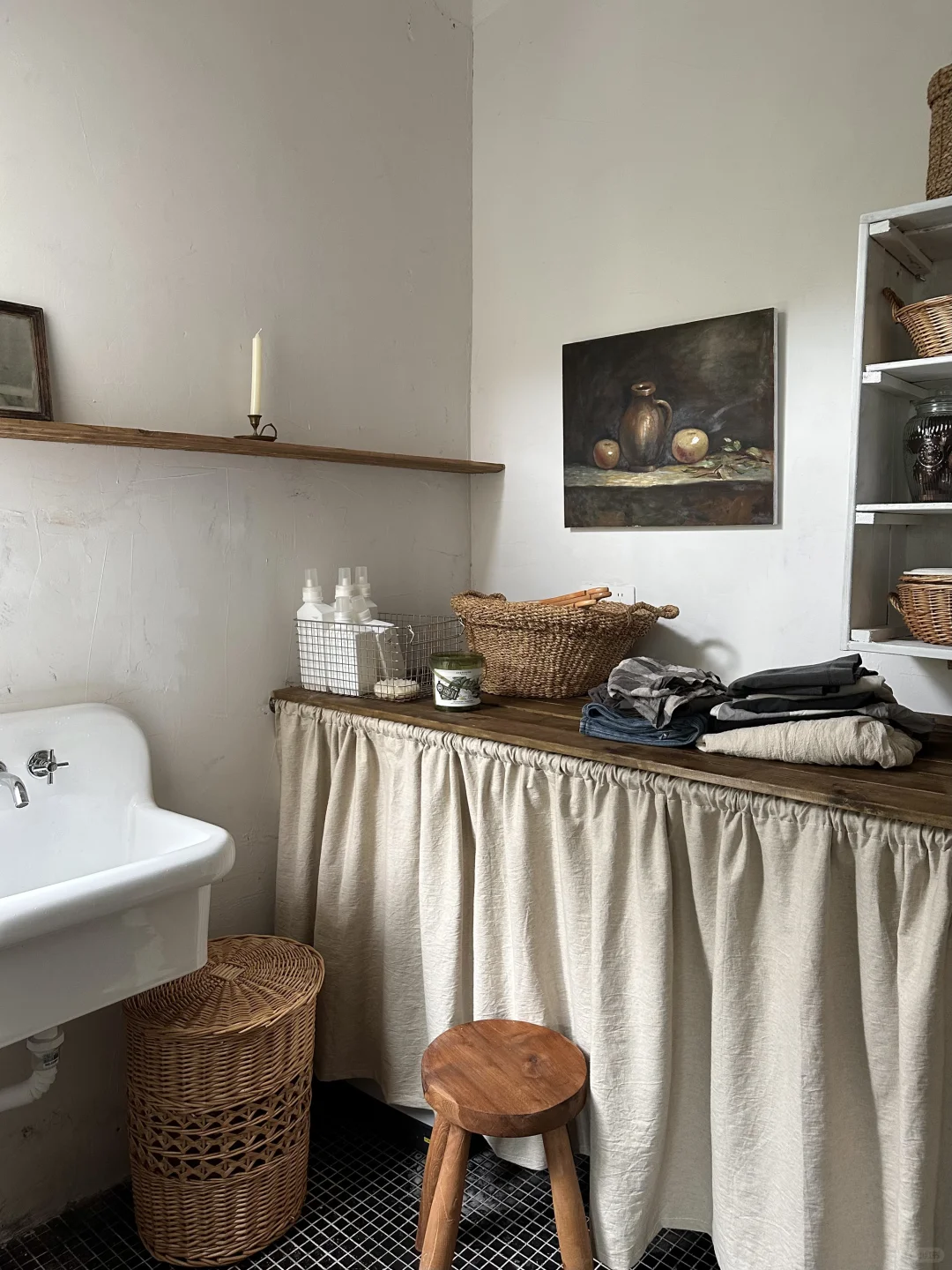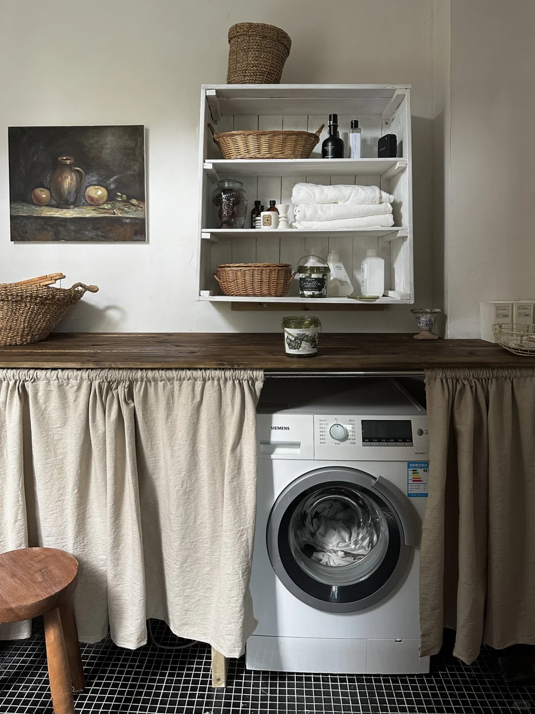 最开始装修这套房子的时候就清晰规划了洗衣房的布局,因为洗衣房涉及很多电位水位,建议也是水电改造的时候就要规划好,地砖也是铺了很喜欢的黑色马赛克砖,结果没想到装修快8个月了才终于搞好。