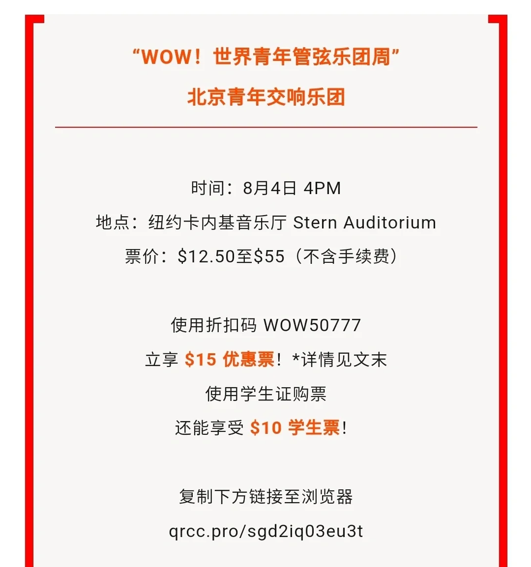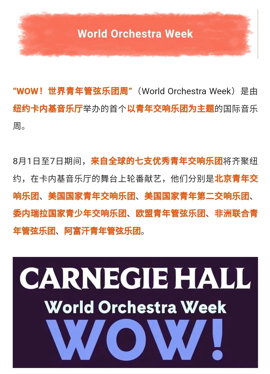 8月1日至7日期间,世 界 级 音乐殿堂 卡内基音乐厅将举办“WOW!世界青年管弦乐团周”World Orchestra Week ,来自全球的七支优 秀 青年交响乐团齐聚一堂,以音乐为媒介,跨越国界,传递友谊与和谐的声音,感受世界的多样与美好!