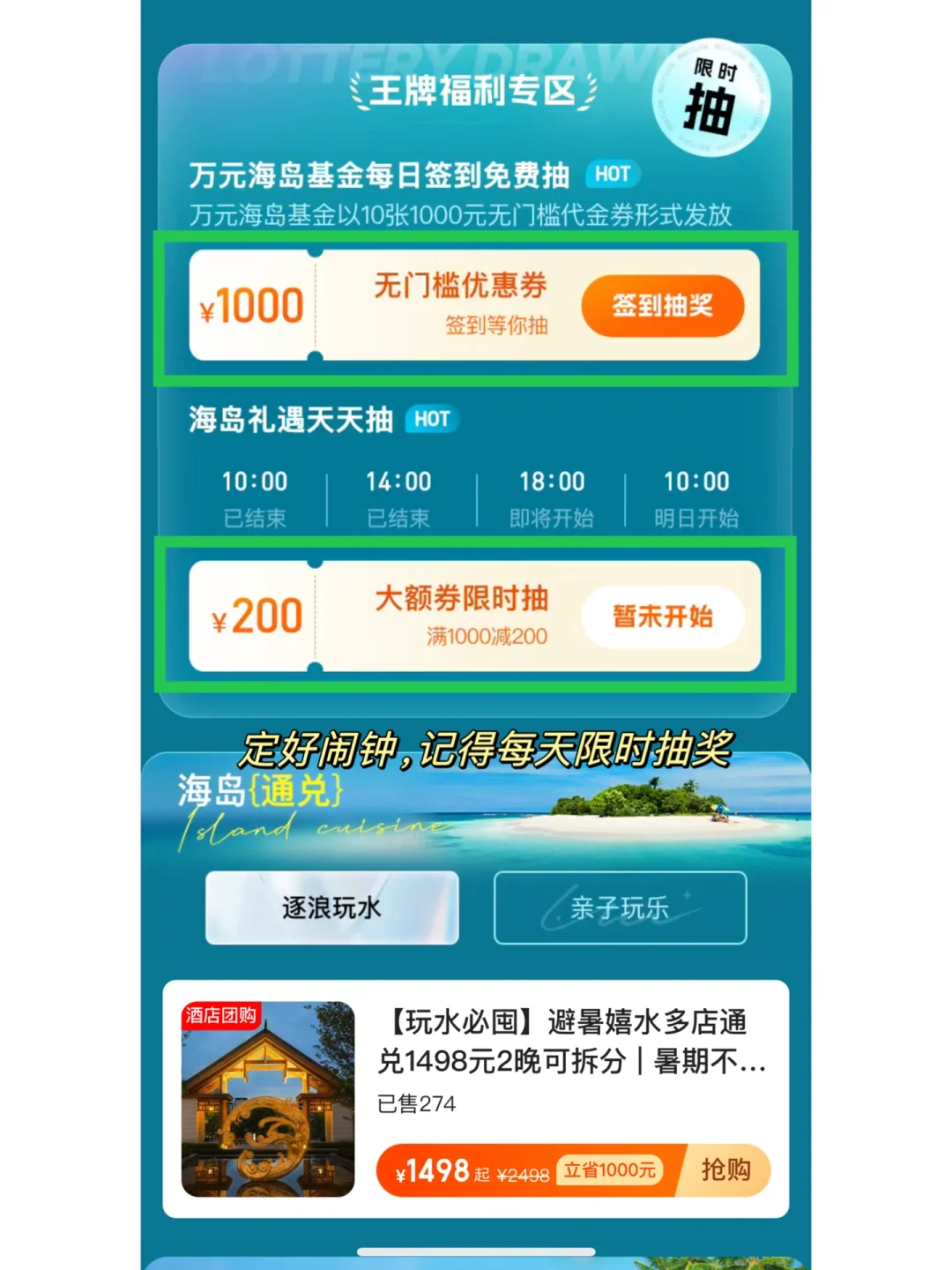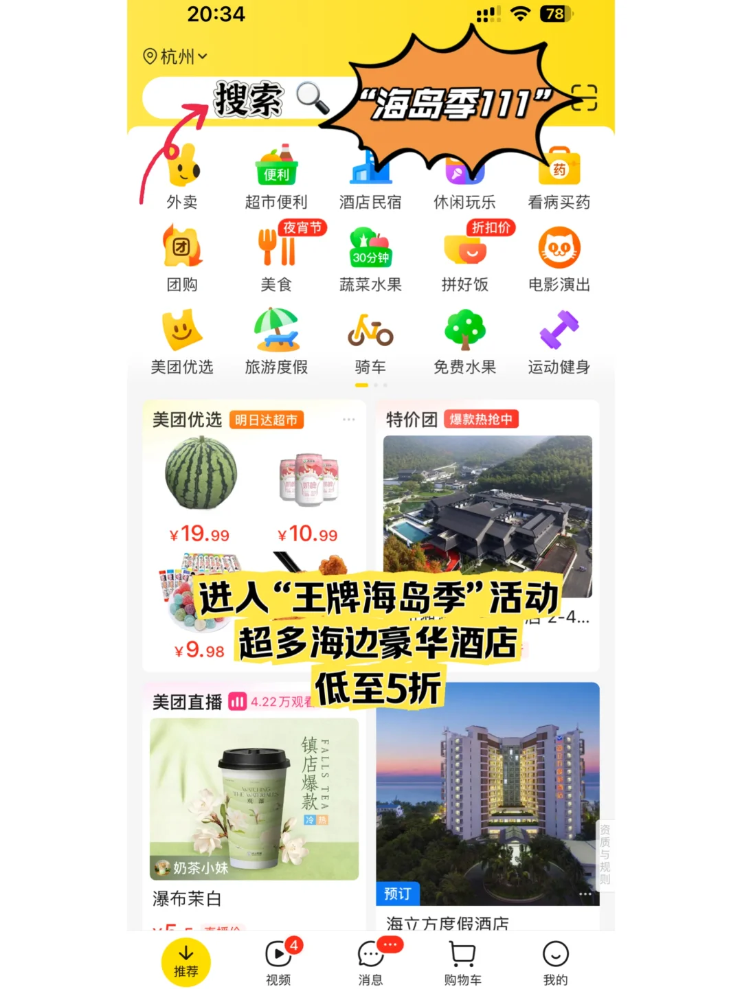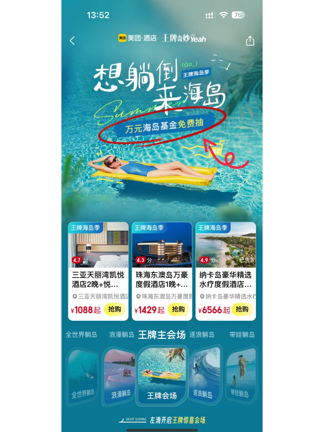 现在美团酒店有【王牌海岛季】的活动,7月25日起,打开APP搜索🔍“海岛季111”即可进入页面,每天都有百万优惠券可以抽,还有超多5️⃣折酒店套餐,超级划算!🥳