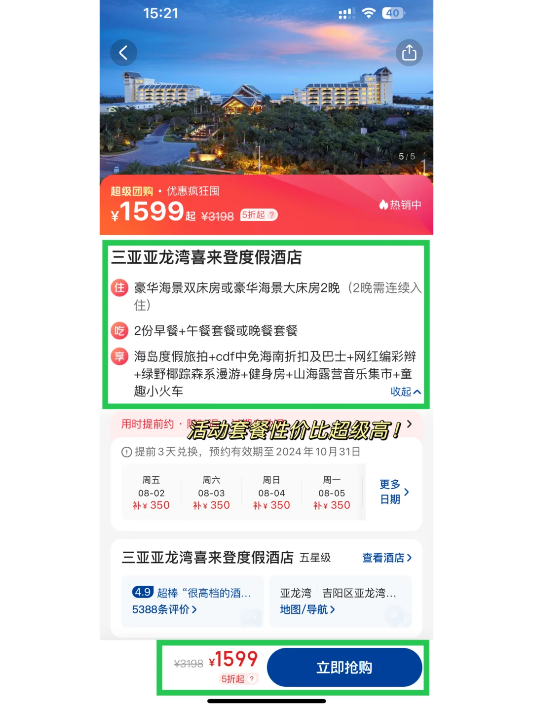 我住的是“三亚亚龙湾喜来登度假酒店”,酒店套餐包含自助早餐和午/晚餐套餐,赠送旅拍和免税店折扣券,还可以体验网红编彩辫,绿野椰棕森系漫游和24小时开放的健身房,还有山海露营音乐集市和童趣小火车。豪华海景房2晚也才1000多,这性价比真的绝绝子!