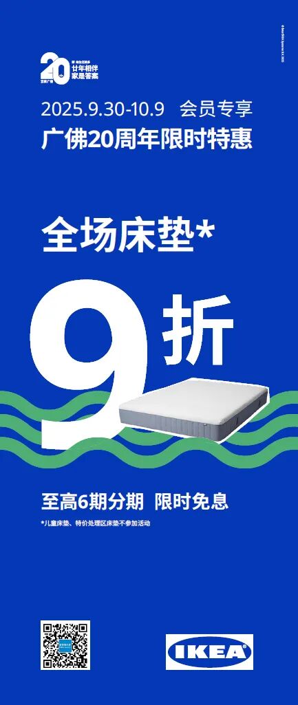 2025是宜家进入广佛市场的第20个年头,作为常伴身边的老朋友,宜家为广佛市民准备了多重惊喜大礼包,精彩纷呈不容错过!即日起至国庆、中秋双节期间,多个空间的家具及家居产品推出满减优惠或折扣优惠,涵盖帕克思衣柜系列、床架、床垫、卧室家纺,完整厨房,以及客厅精选皮沙发等多个品类。