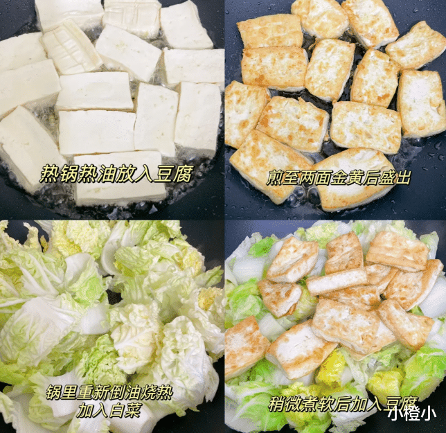 做这道菜,选材讲究一个“鲜”字。白菜最好用大白菜的嫩心部分,叶片肥厚、帮子脆甜,洗净后斜刀切成段,这样更容易入味又保持口感。豆腐呢?老豆腐(北豆腐)是首选!它质地紧实,久煮不碎,吸汁力强,炖出来外微韧内软嫩,比嫩豆腐更有嚼头。把豆腐切成1.5厘米见方的小块,先别急着下锅,有个小技巧能让它更香还不碎:平底锅放少许油,中小火把豆腐煎至六面微黄,表面略带焦香——这一步不仅能去豆腥,还能让豆腐在炖煮时牢牢锁住形状,咬起来更有层次感。