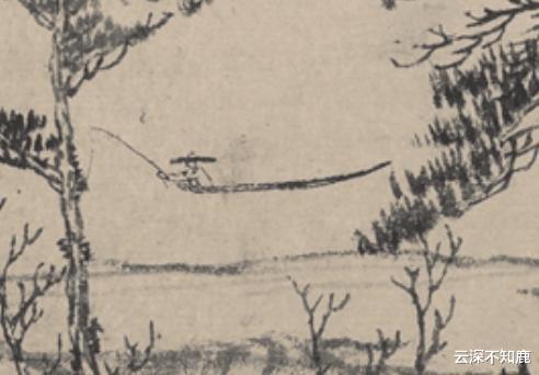 与樵夫分别后往左行,眼前近处有几座稍低矮的山头。随后江景有变,江面成了近景,大山成远景,可见黄公望作画用心。江面上泊着一叶扁舟,有戴蓑笠的渔夫悠然垂钓,此乃画中第三人。