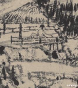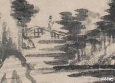 《富春山居图》已至尾声,最后那尖顶山峰现于眼前,填满画面,墨色转淡,山色入水色,余韵绵绵。惊喜的是,此峰右侧有桥,桥上一人拄杖过桥,是画中第八也是最后一人,与第一人相向而行,呼应起来。