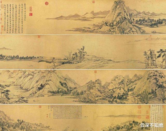 目光沿“剩山图”的江面往左移,就来到更开阔的江面处啦。这可是现存《富春山居图》较大一截,是主体部分,长约6.36米,叫“无用师卷”。无用师即黄公望道教师弟,1347年,他陪79岁黄公望至富春江畔,求画,黄公望画了四年,1350年绘完赠之。