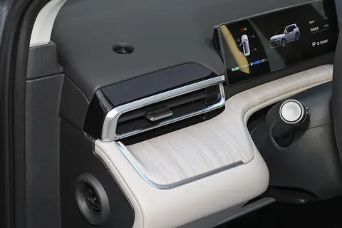 内饰环节,i60 把家用氛围营造得很到位,这也是我个人比较关注的点。车内大面积采用了软包材质和弧面设计,没有过多生硬的棱角,从视觉和触觉上都能带来舒适感。实地坐进车内,前后排的环抱感很明显,就像被包裹住一样,不会有空旷的疏离感。车内配备了接近 4 米长的柔光氛围灯,晚上开车时点亮,能营造出类似家里的温馨感,没有那种纯科技感车型的冰冷和生硬。内饰的配色也很讲究,燕麦奶白、暖绒浅棕和大溪地灰三种颜色都是低饱和度的色调,视觉上很舒缓,我带过去的老人和孩子都反馈说看着很舒服,不会觉得刺眼。车内的木纹装饰也做得比较自然,没有明显的塑料感,提升了内饰的整体质感。