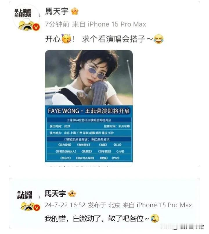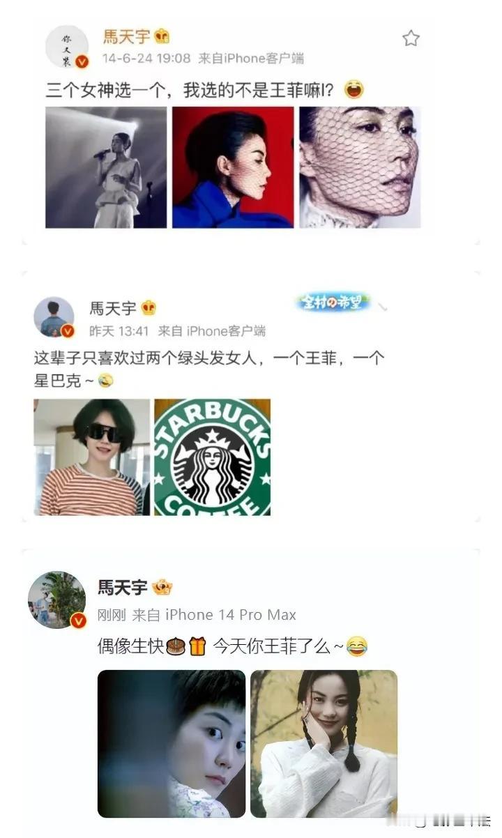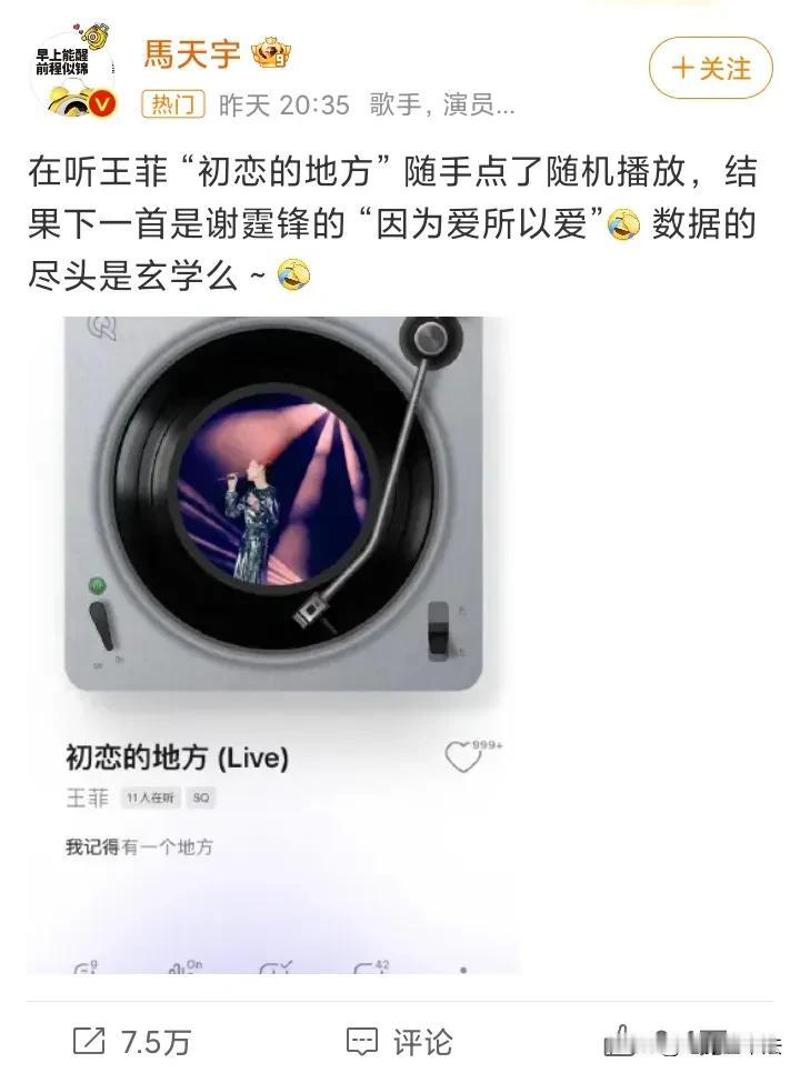 马天宇,好八卦! 7月31日,马天宇引起热议,原因是他在7月30日发布了一条关于王菲和谢霆锋的动态。 原来他在听王菲“初恋的地方”时,随手点了随机播放,结果出来的是谢霆锋的“因为爱所以爱”,他还感叹:数据的尽头是玄学么? 网友看后纷纷评论: 你小汁作为王菲的粉丝,居然不点收藏? 大数据诚不欺我,我被马天宇包围了。 big胆! 哈哈,情敌忽然就出现。 说明大数据也爱磕。 我以为是高仿号。 你小子是什么都敢在网上发啊。 …… 其实大数据推送相关两个歌手的歌曲是很常见的事,不信马天宇不知道,所以他大概率就是故意蹭一下热度了,当然了,因为他的形象一直不错,所以也没什么人会计较这些,毕竟明星一般发文,不是通告就是蹭热度,另外,有几个明星是真正自己本人在发文呢?所以,大概率就是精心策划的剧本。