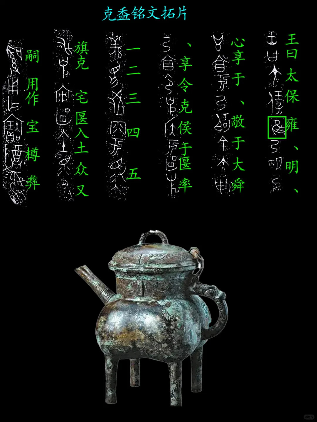 铭文:“曾”侯乍(作)父乙宝樽彝(从上向下,从左往右读)。