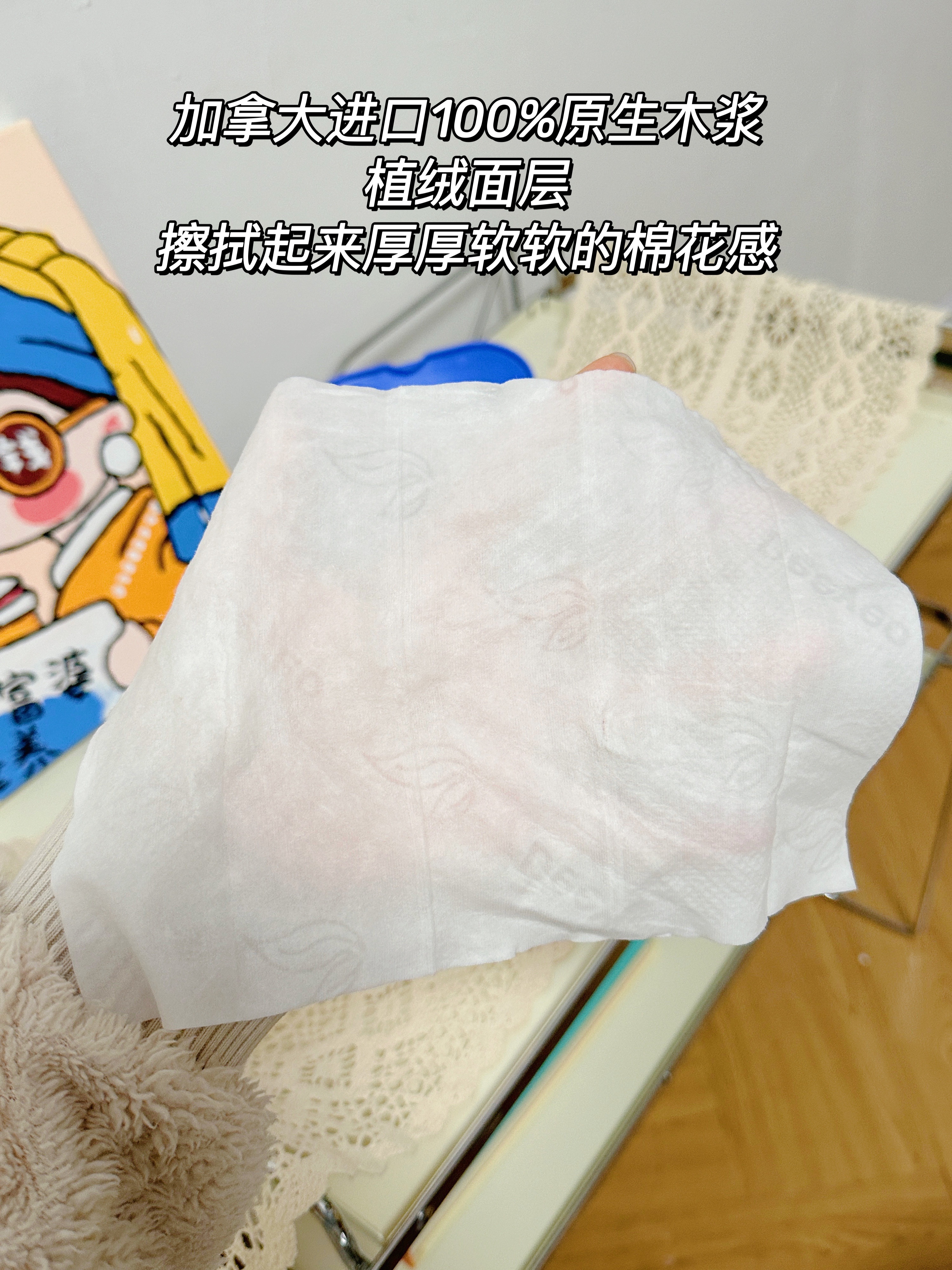 并且它是植绒面层,擦拭起来厚厚软软的棉花感,因为加拿大进口100%原生木浆。