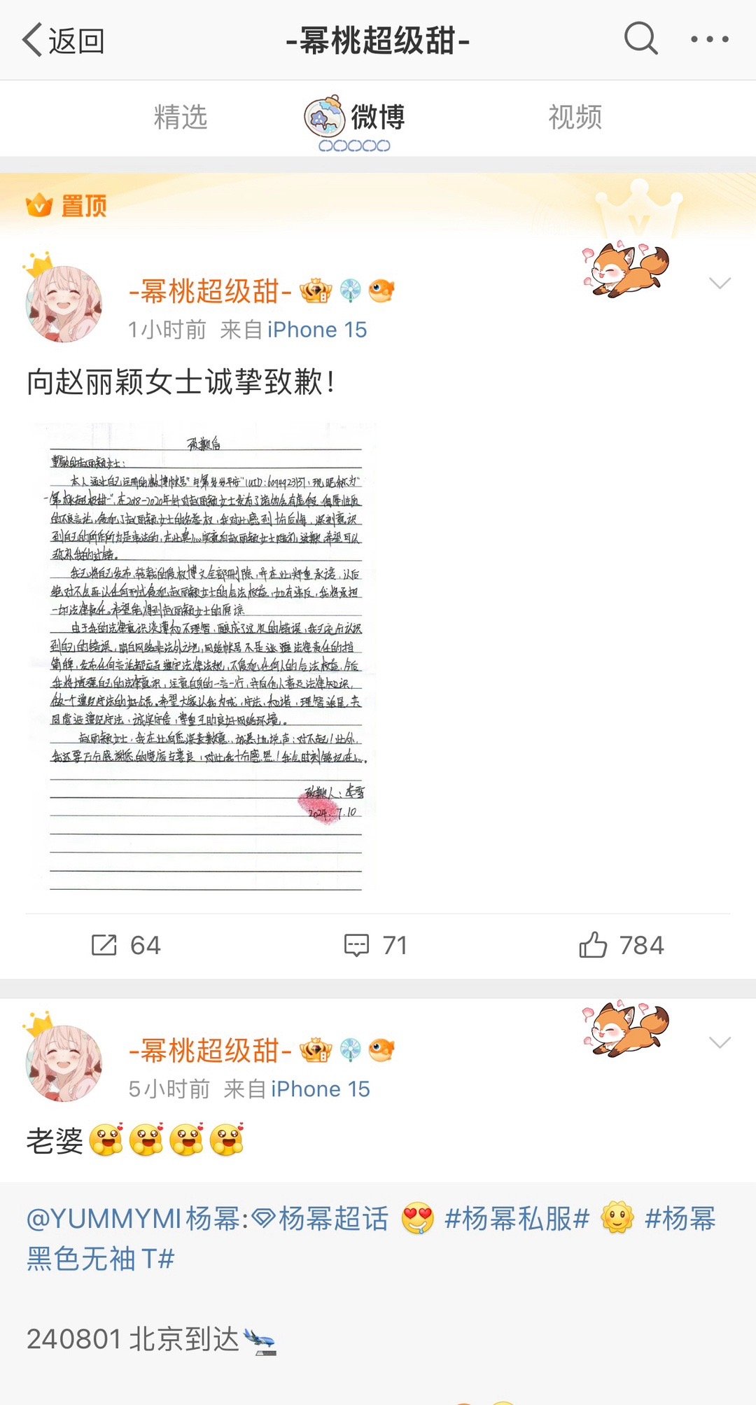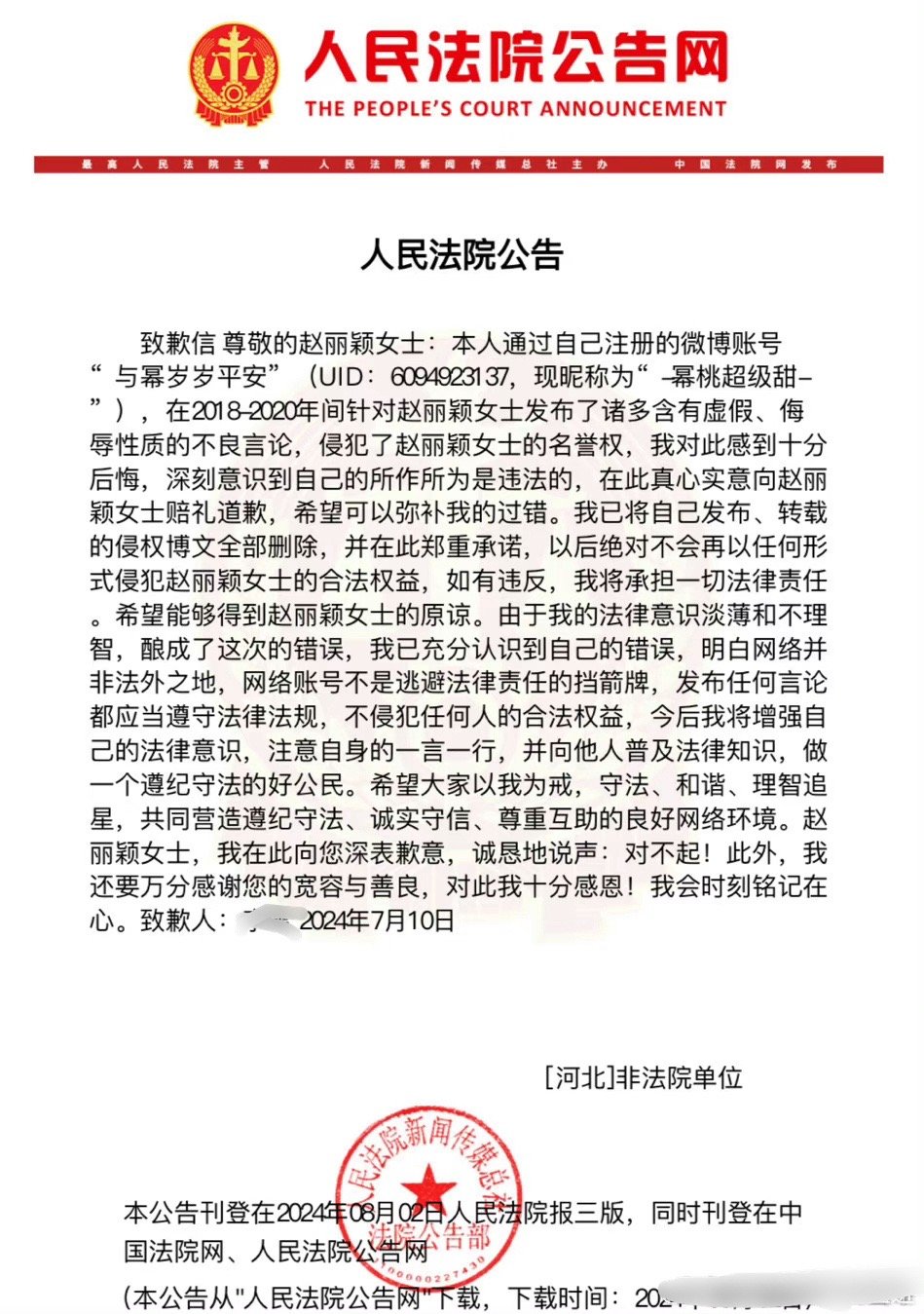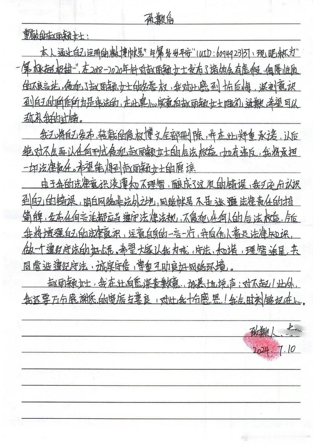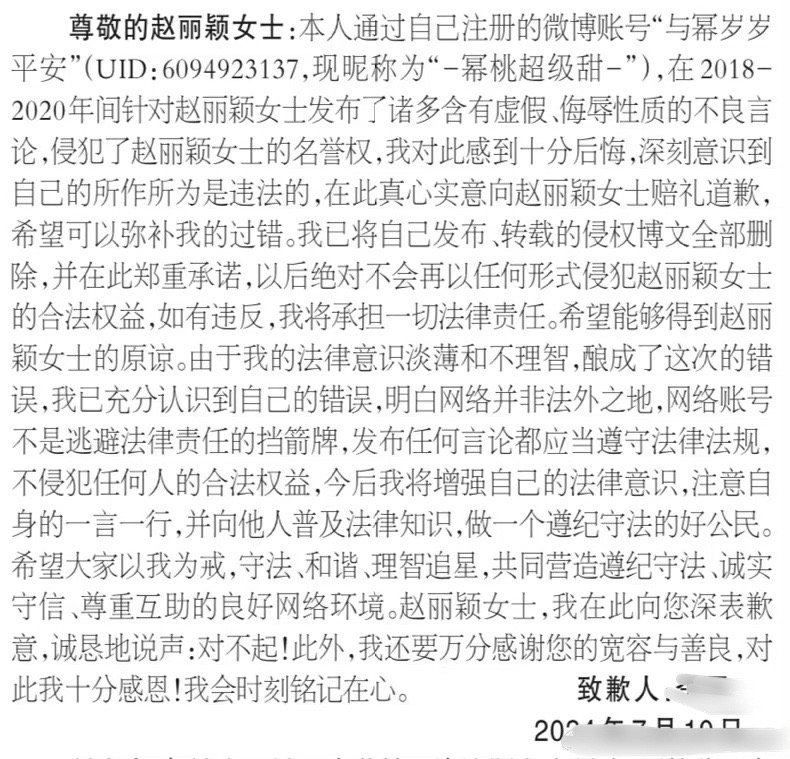 法院公告赵丽颖黑粉致歉信,同时“-幂桃超级甜-”手写道歉信发微博并置顶,向赵丽颖