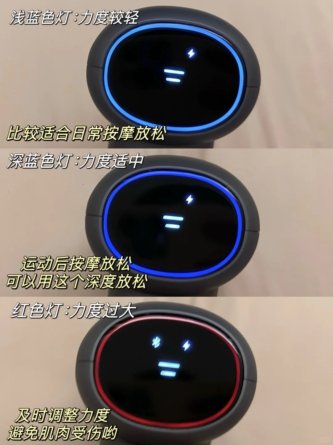 【浅蓝色轻柔,深蓝色适中,红色力度过大】