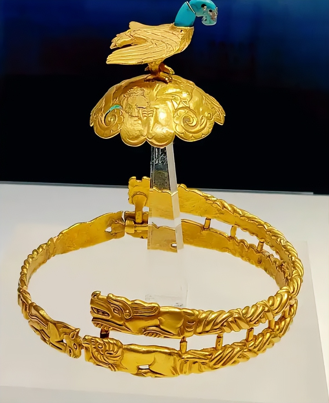 这顶金冠分两部分,冠顶是一只展翅的雄鹰,用金片锤揲而成,翅膀上嵌着绿松石,眼睛是红宝石点缀。