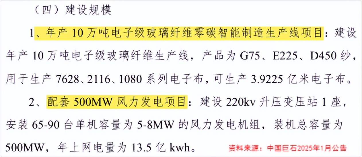 为了巩固公司在电子级玻纤市场的竞争力,加快调整产品结构,2025年2月,中国巨石斥资58亿元在淮安建设了10万吨电子级玻璃纤维零碳智能制造生产线项目,并配套建设500MW风力发电工程项目。