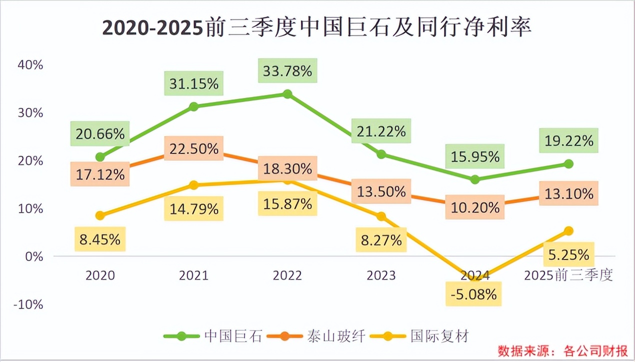 2025年前三季度,中国巨石净利率达到19.22%,较2024年提升3.3个百分点,比同行高6到14个百分点。