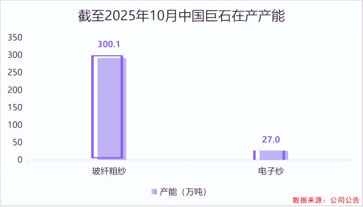 截至2025年10月末,中国巨石共有23条在产粗纱生产线,在产产能达到300.1万吨;5条电子纱生产线,在产产能为27万吨,均为全球第一,并且具备9.6亿米电子纱产能,全球市占率达到23%。