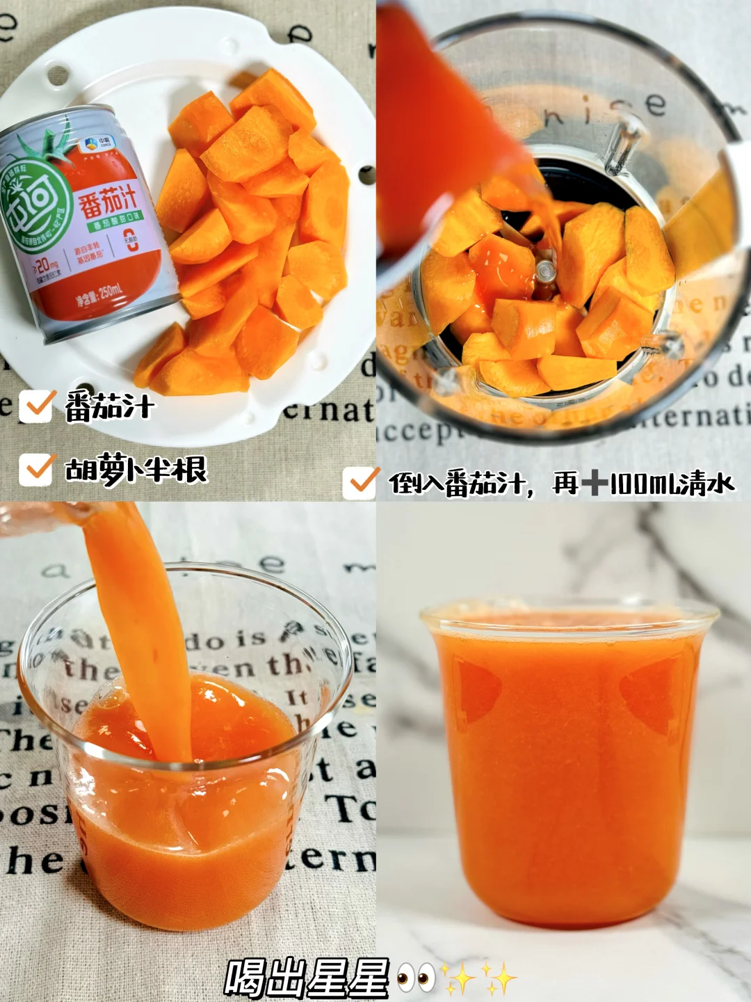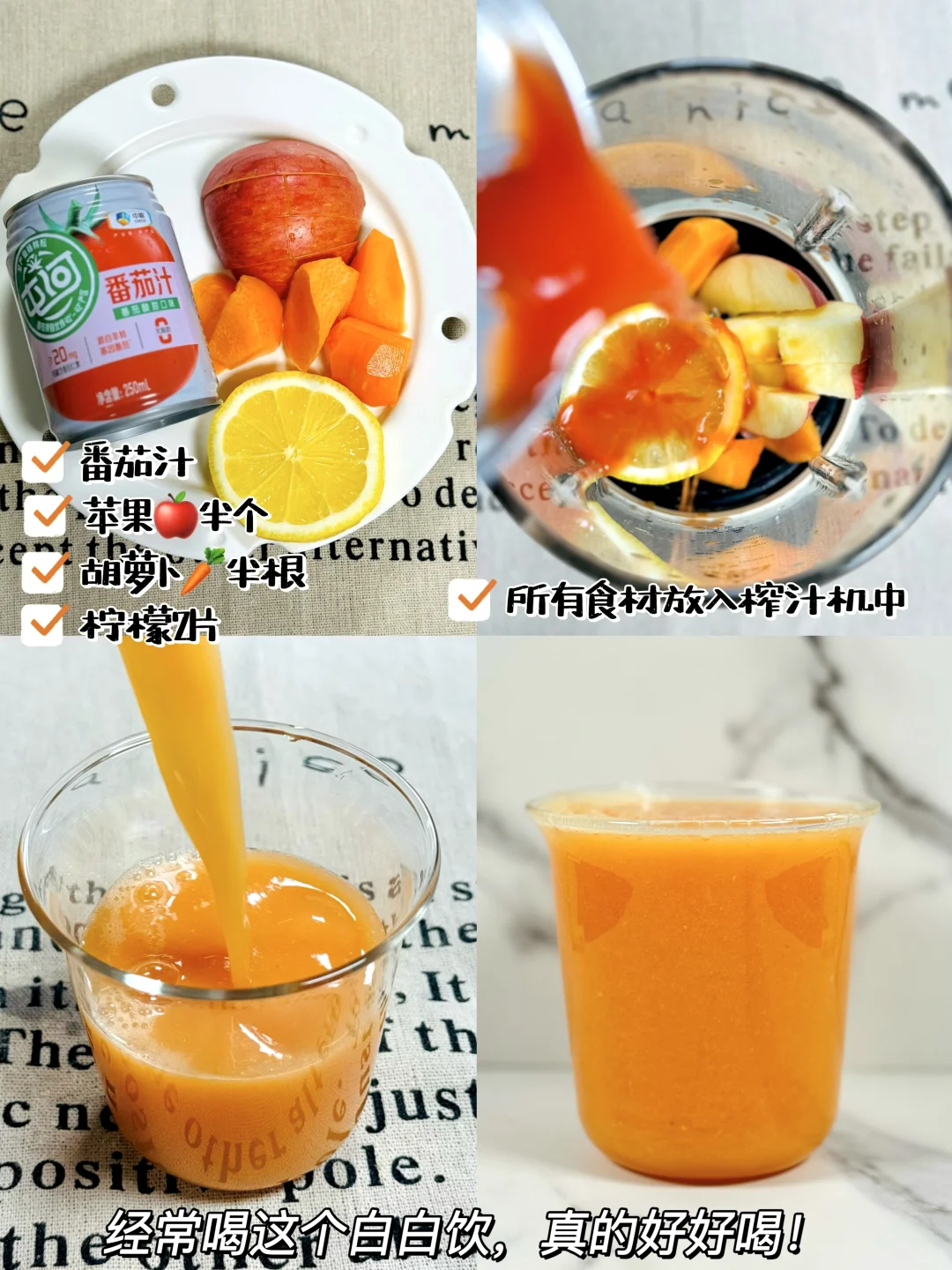 1️⃣番茄汁➕苹果🍎半个➕胡萝卜🥕半根➕柠檬2片
