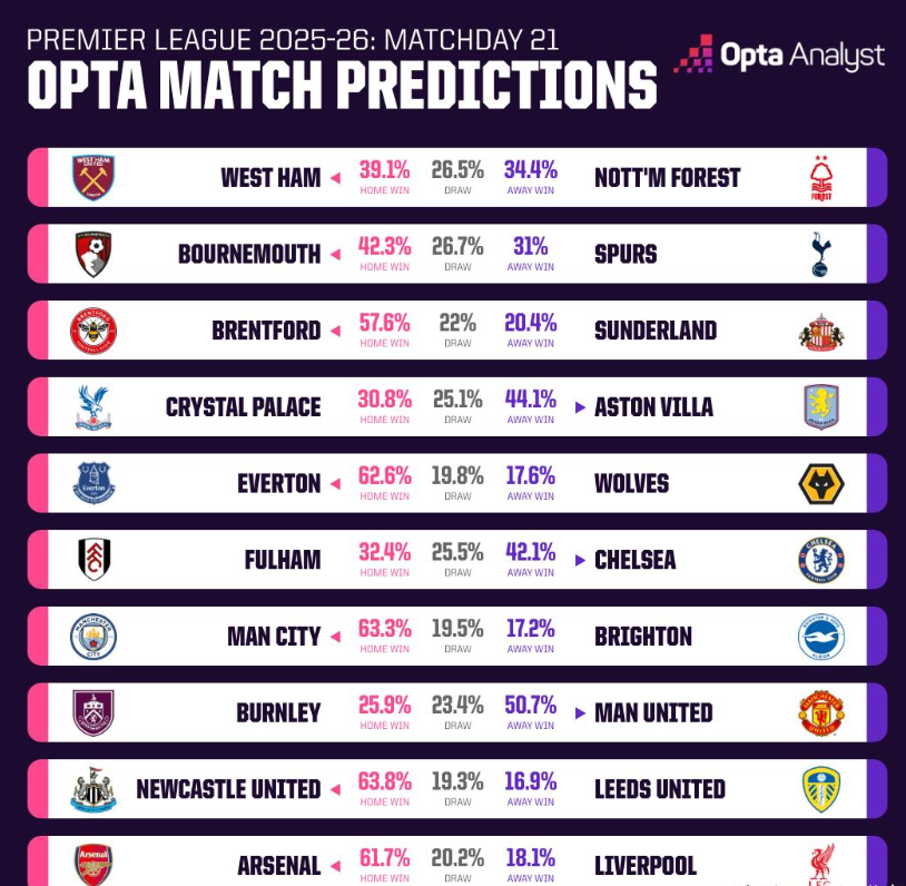 其他场次也有分歧。像富勒姆对切尔西,Opta觉得切尔西客场取胜概率(42.1%)明显高于富勒姆(32.4%),但SI FC则认为两队会1比1握手言和。伯恩利对曼联,Opta模型里曼联优势并不巨大,但SI FC坚信曼联能1比0小胜过关。这些差异恰恰说明了足球的魅力——数据是死的,比赛是活的,球场上的每一分钟都充满变数。