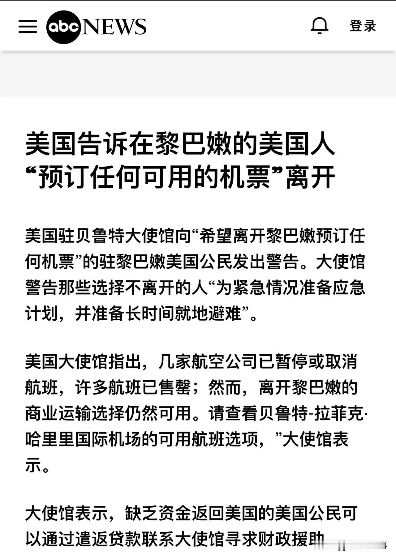 真坐不住了,美国表态! 来自美国广播公司(3)日消息,美国驻贝鲁特大使馆向黎巴嫩境内的美国公民发出警告,请他们预订任何可用的机票离开黎巴嫩。 有评论表示,美国这次是真坐不住,急了。看情况中东的局势会比我们原先想象的更紧张、更让人担心。