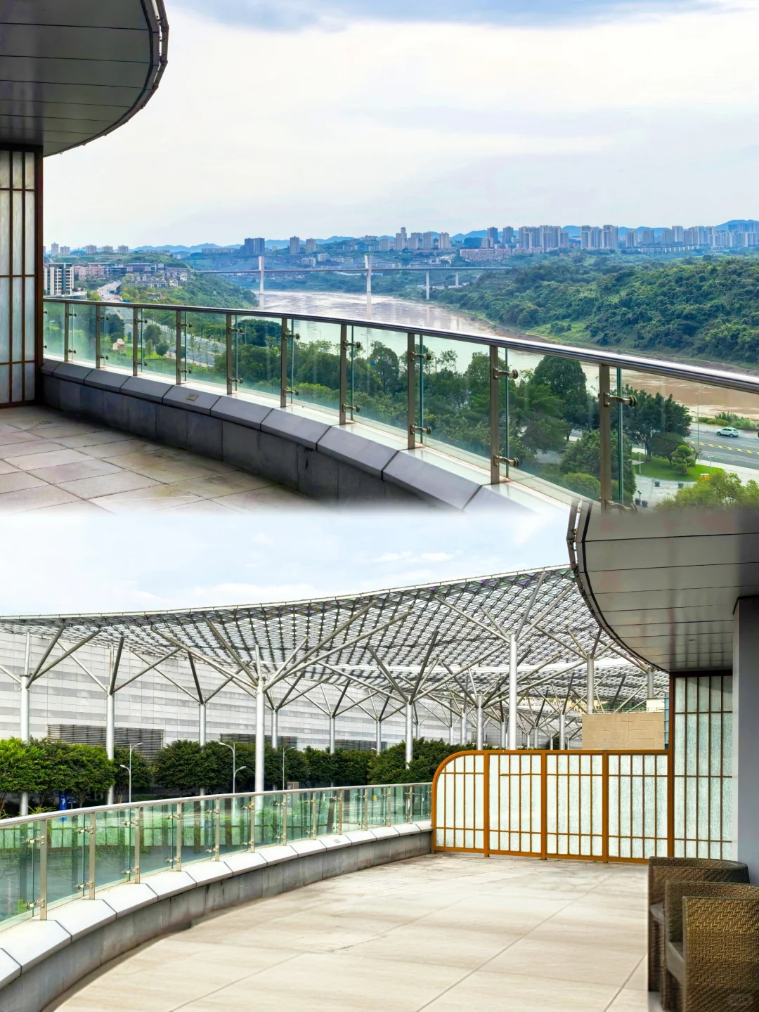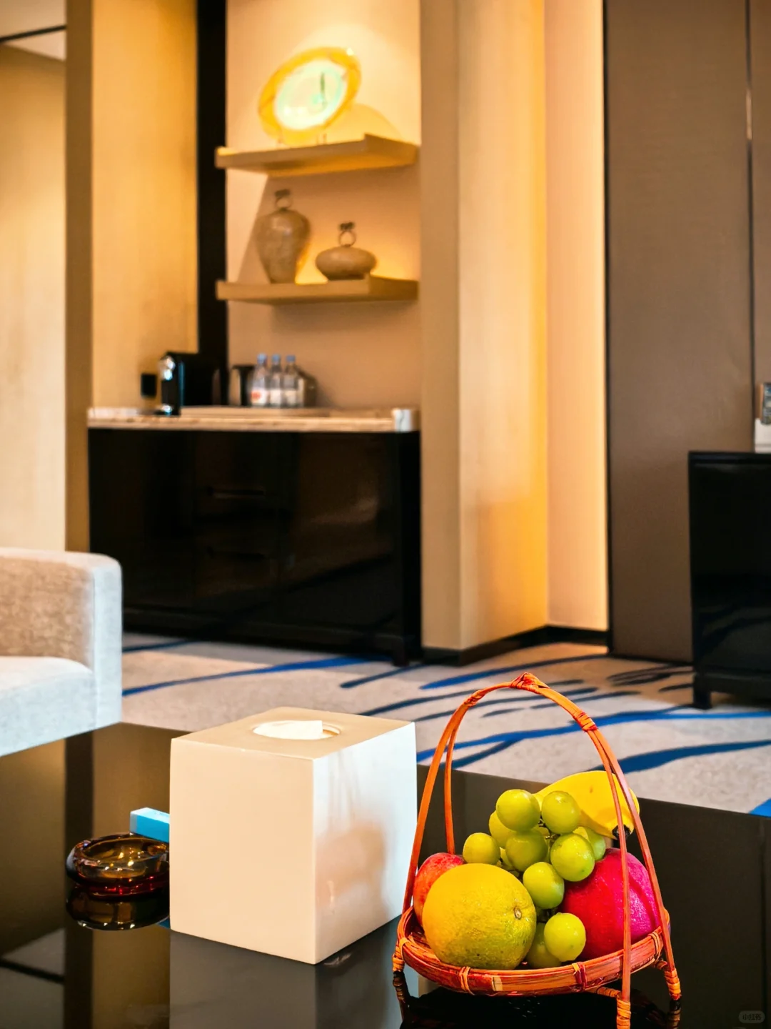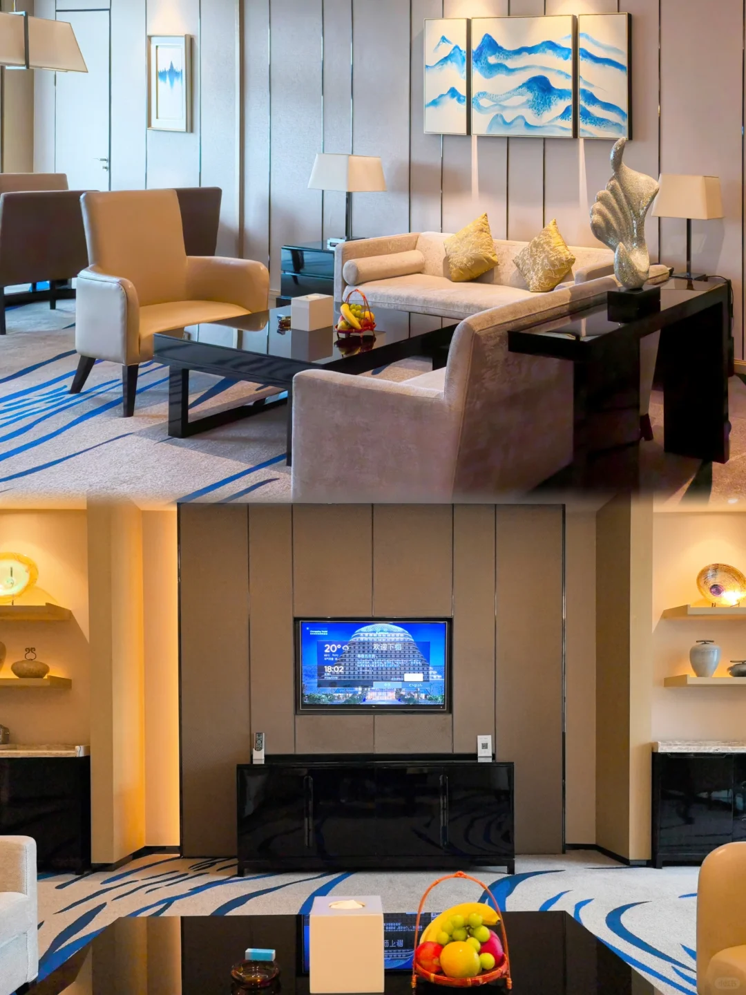 房间面积135平,进门右手边是客卫,左手边是开放式玄关,客厅和卧室连接处设有衣帽间。值得一提的是,这家主卫和客卫罕见地同时配有TOTO卫洗丽,洗护备品是小瓶的法国达曼娜。卧室里的120度落地窗,视觉效果非常棒,外面的阳台也是120度看江景,面积超大,视野绝佳。迷你吧全免费,软饮小食都有,还有胶囊咖啡,欢迎水果非常新鲜!在我住过的重庆酒店里,这个欢迎水果的水准可以排进Top 3。