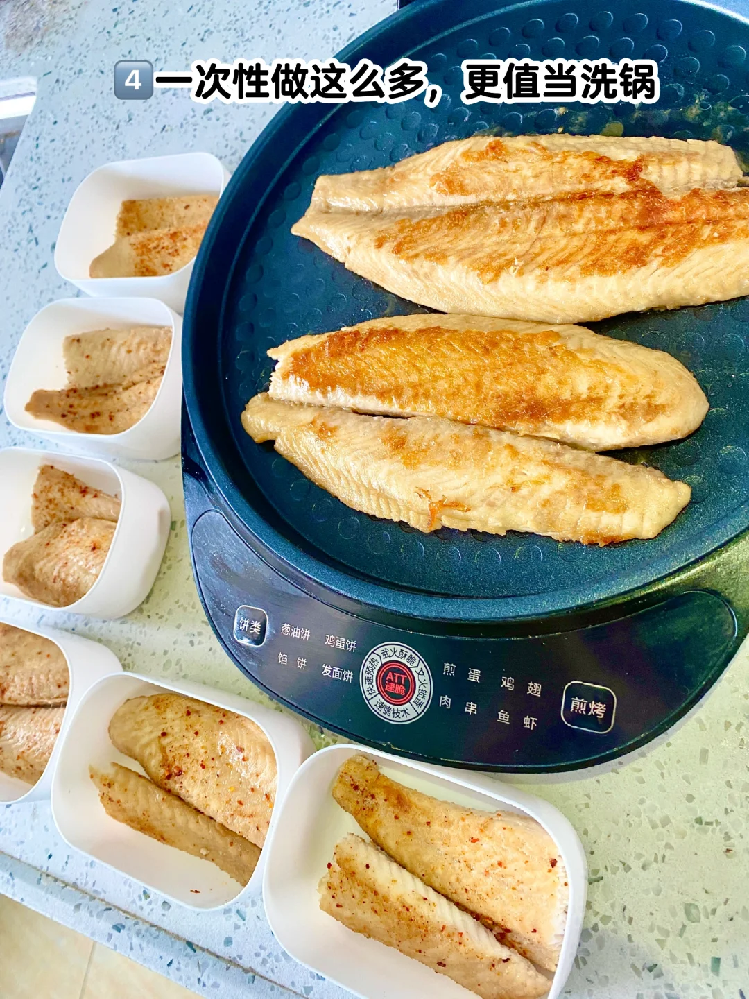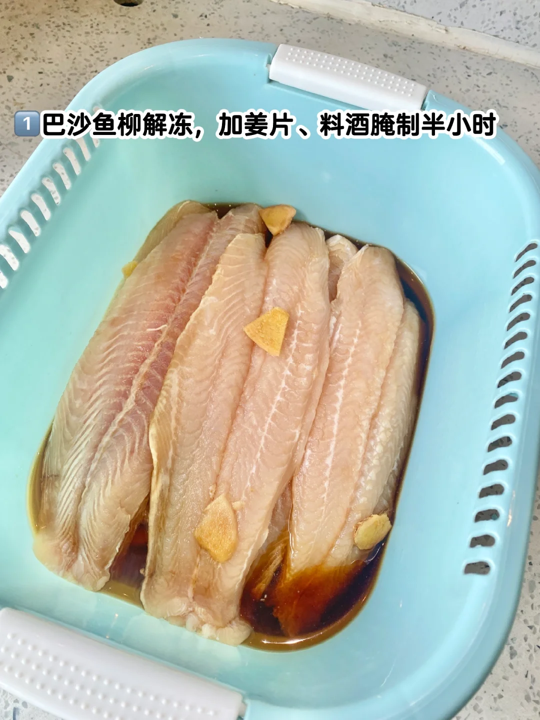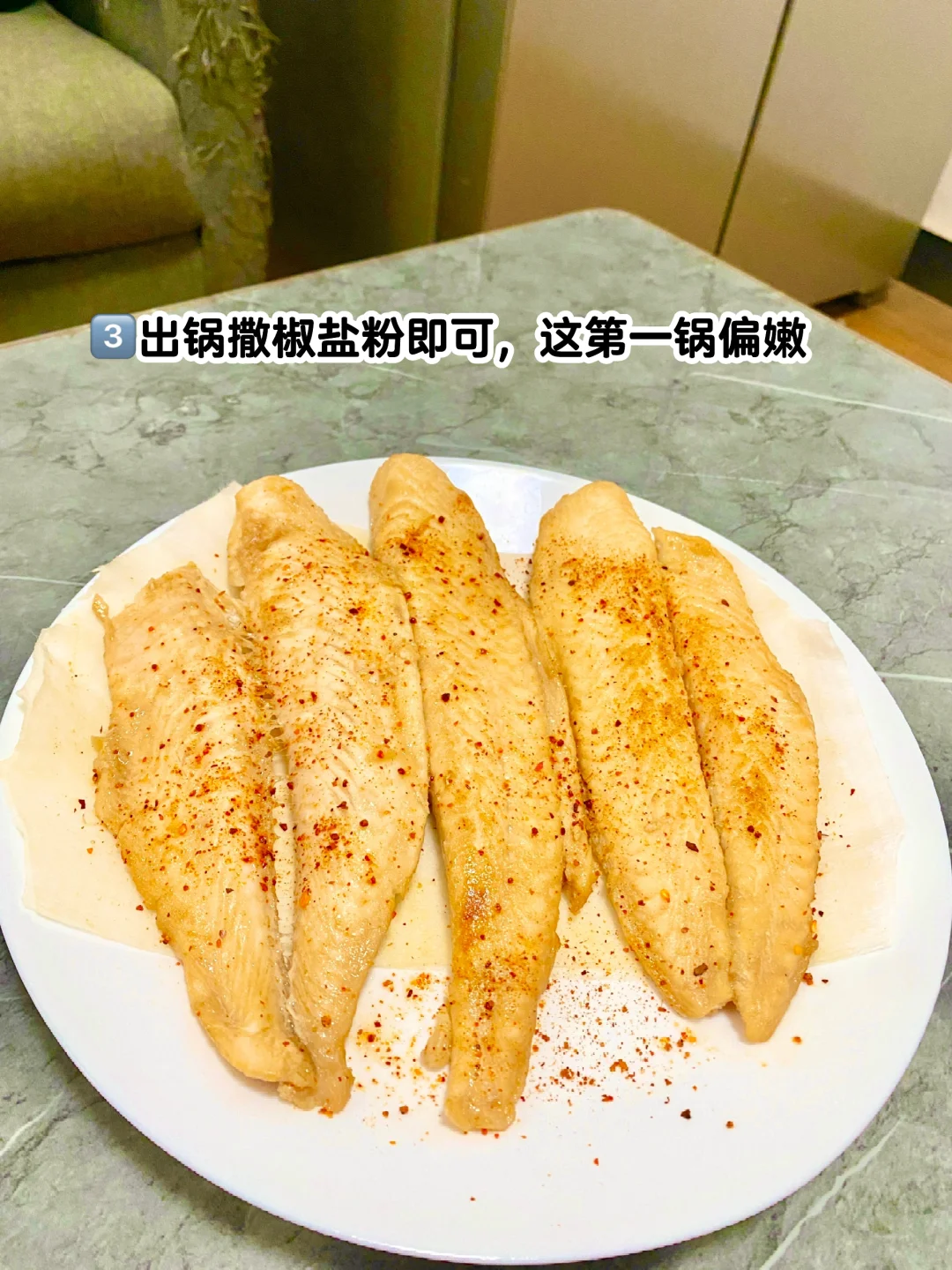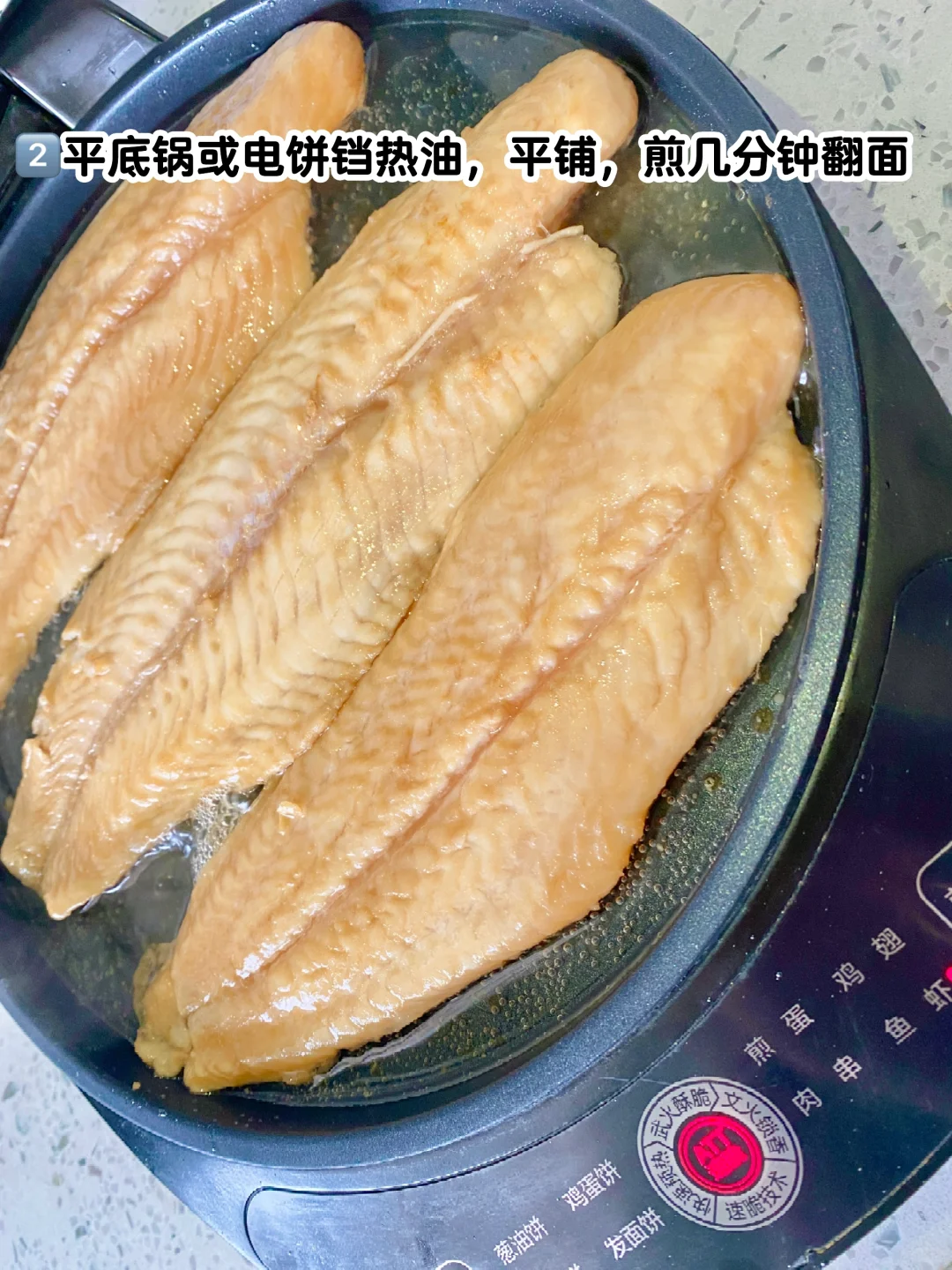 1️⃣巴沙鱼柳解冻,加姜片、料酒腌制半小时 2️⃣平底锅或电饼铛热油,平铺,煎几分钟翻面 3️⃣出锅撒椒盐粉即可