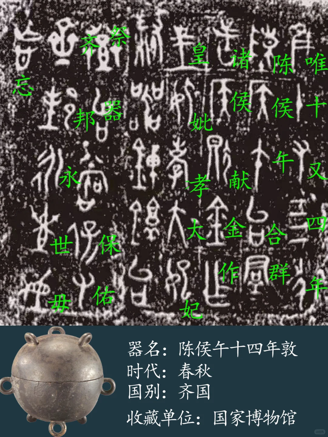 铭文:唯十四又四年,陈侯午合群诸侯献金作皇妣孝大妃祭器~保佑齐邦,永世毋忘。