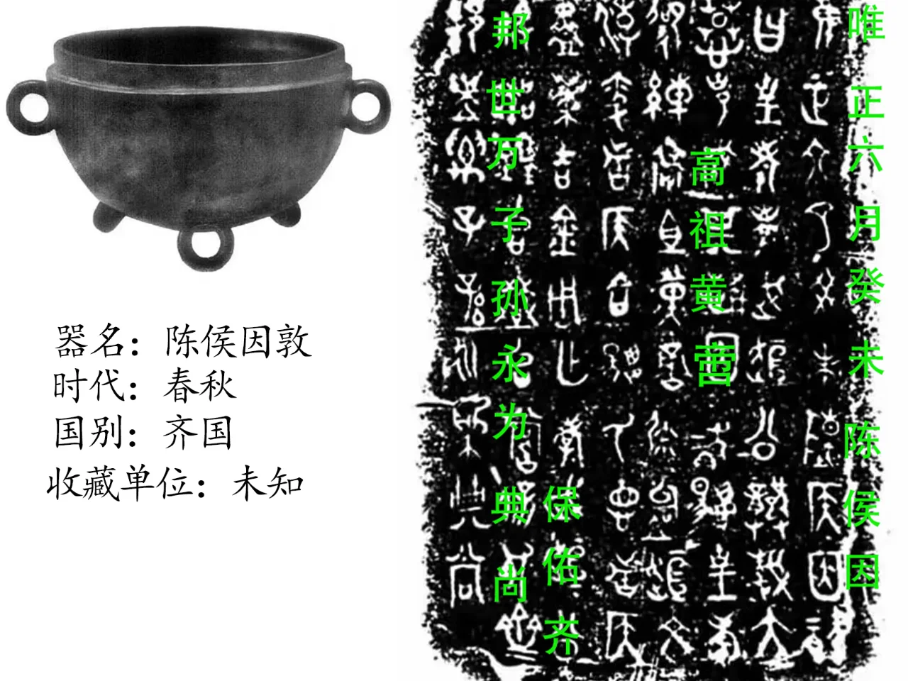 释文:某年六月,陈侯因左国社高祖为:黄帝,保佑齐邦万世,子孙永为典尚(不得更改)。