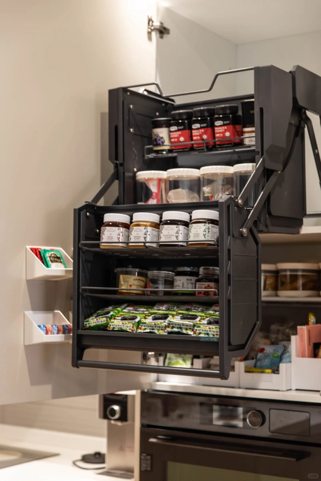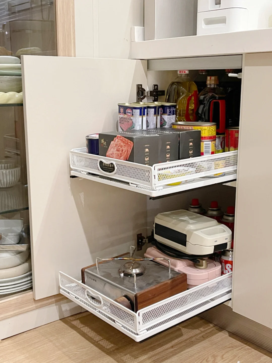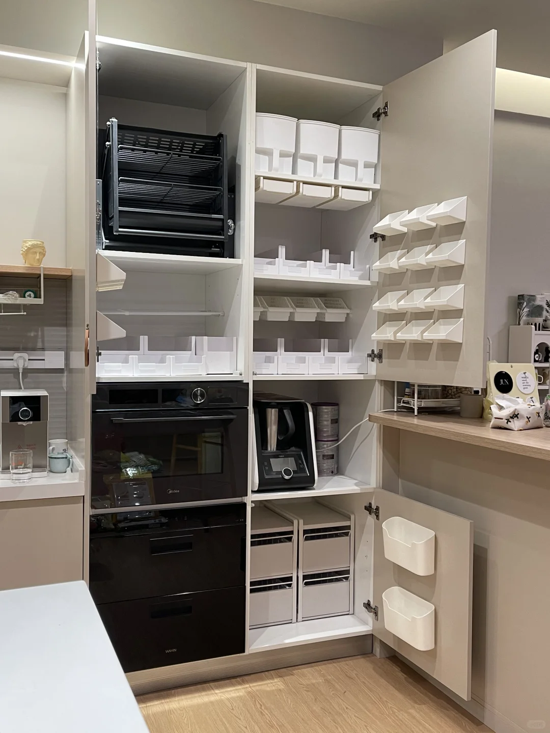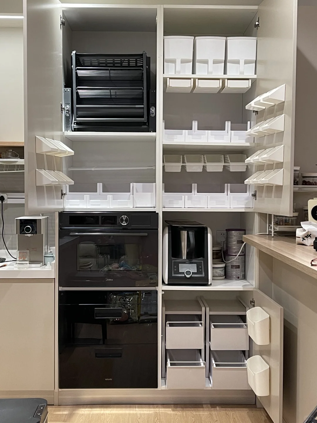 厨房橱柜的定制当时也没有想得很仔细,例如平开门柜子太多,导致拿取不方便,利用率低,慢慢把岛台柜,高柜和地柜的收纳空间都改造了一遍,真的顺手好用了很多,分享给各位姊妹。