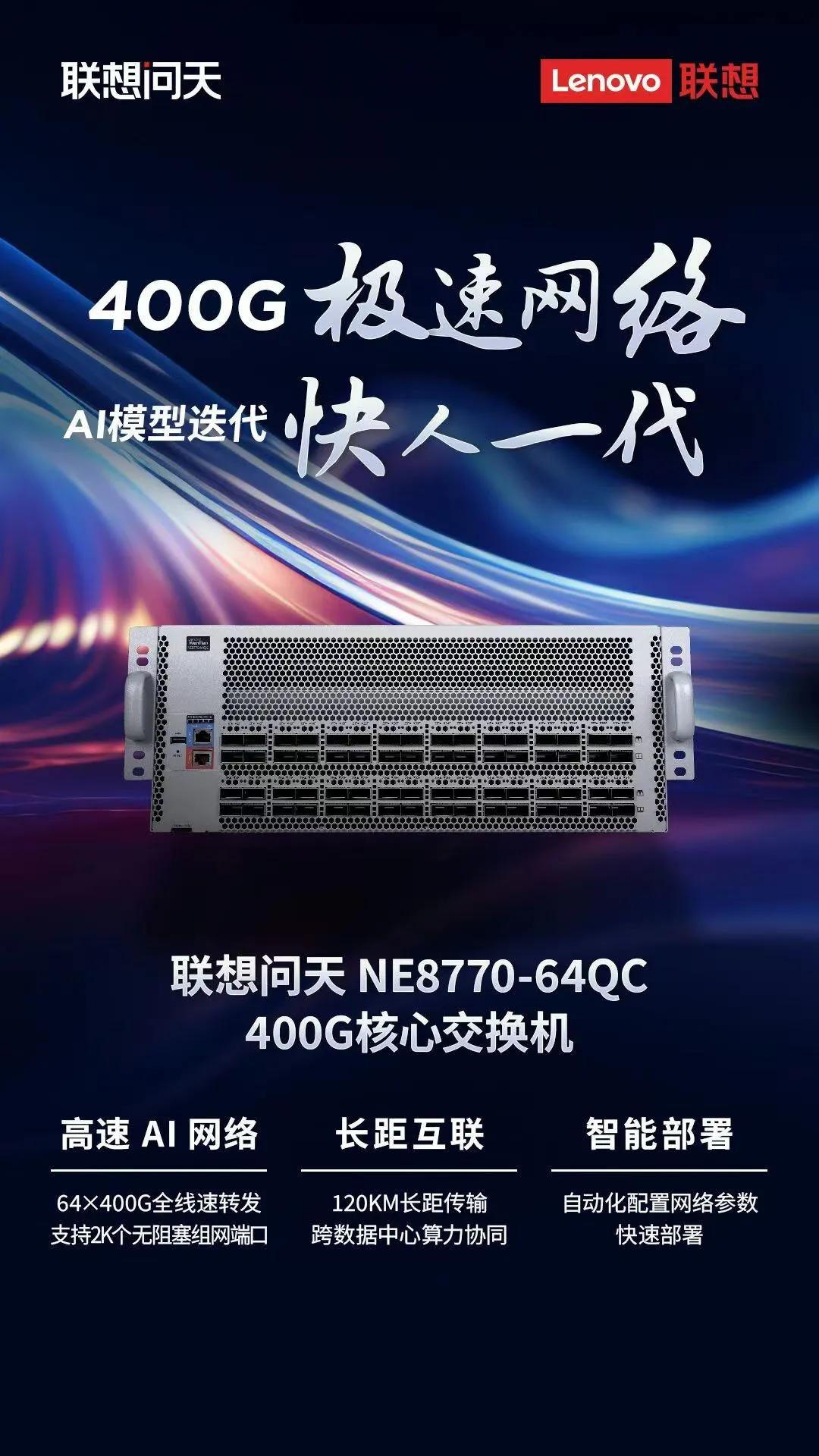 首先,在智算中心领域,人工智能、机器学习、高性能计算和分布式存储等应用的快速发展,正推动数据中心网络向400G/800G升级。为应对这一趋势,联想问天NE8770-64QC交换机“应运而生”,该产品是专为高端数据中心及AIGC智算场景设计的高性能、高密度盒式交换设备,可满足下一代智算基础设施对高速互联与大规模数据处理的迫切需求。
