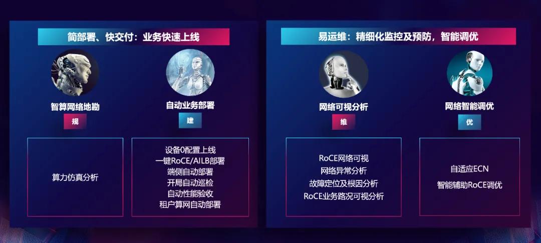 在“简部署、快交付”方面,传统AI集群——尤其是千卡规模的RoCE网络部署——往往极为复杂且耗时。通常交付人员需依赖专家经验,手动逐台配置交换机中的复杂RoCE参数(如ECN/PFC水线),再通过反复手工打流测试进行调优。该过程常持续一至两周,才能获得相对理想的配置,整体效率低下,且高度依赖人力经验。