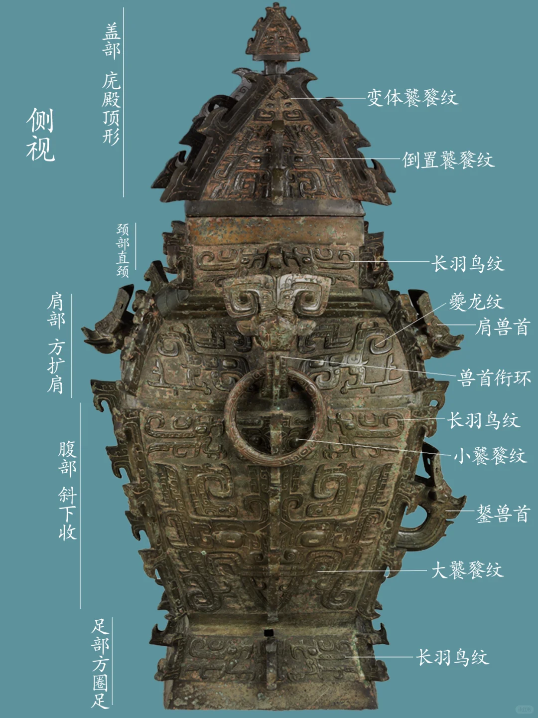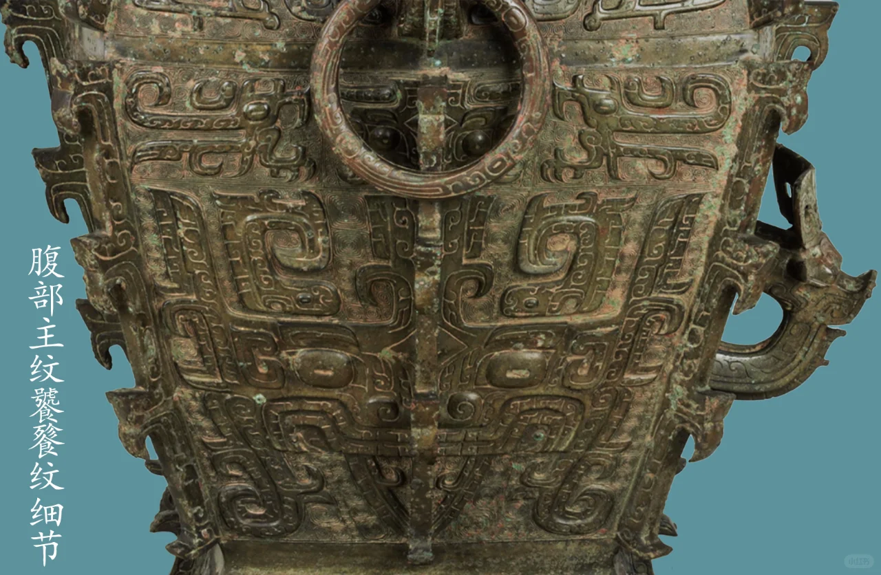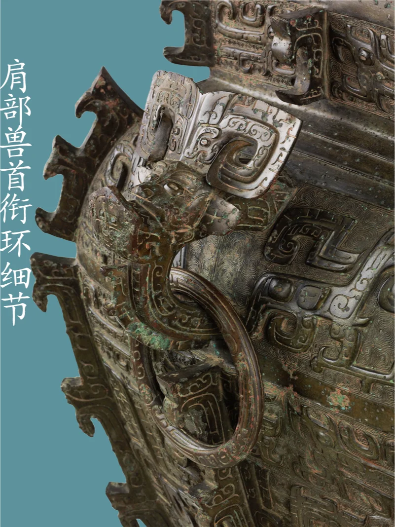 器身,颈部四面各饰一组两两相对的长羽鸟纹二只,中间以扉棱隔断。肩部两侧正中各置一圆雕卷角兽首衔环,两卷角面各饰一阴线夔龙纹,肩部前后正中各置一卷角横耳兽首,两卷角面各饰一阴线夔龙纹,肩部正中兽首圆雕兽首,眼上眉骨凸起,长弯月形眉毛清晰,眼后侧张一对心形耳;耳面以阴线勾勒出耳蜗;额定耸起一对片状卷角,从中部对称的向侧面弯转下披;角根粗大,面饰夔龙纹。勾形长角,角根部内平卷,下为凸隆圆起示兽鼻头,张口浮雕獠牙,口出一圆雕近长尖状齿;肩部四侧面各饰一组两两相对的两只夔龙纹,腹部四面各饰一组高浮雕大饕餮纹,每组以中部扉棱为界,腹上部(大饕餮纹上)四面各饰一组两两相对的长羽鸟纹二只,两鸟间饰小牛角饕餮纹,圈足四面各饰一组两两相对的长羽鸟纹二只,每组以中部扉棱为界。