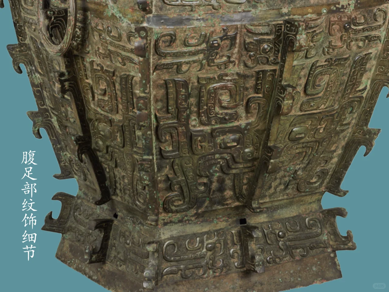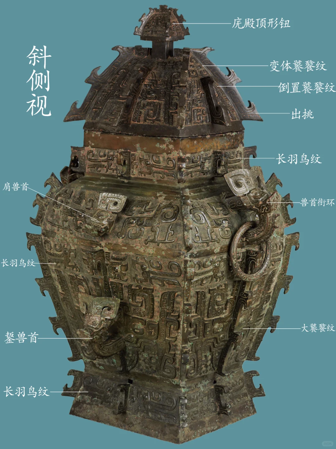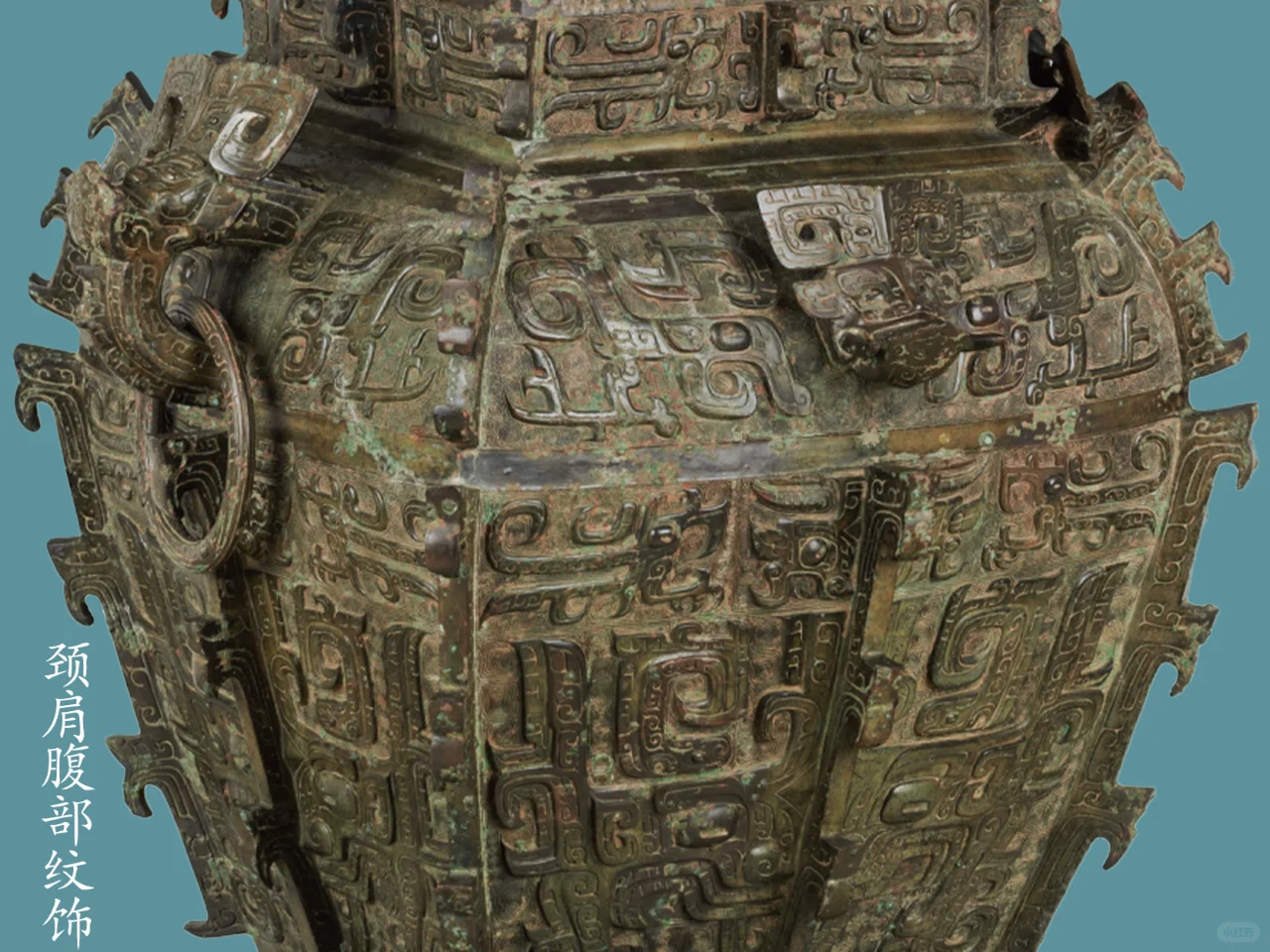 器身,颈部四面各饰一组两两相对的长羽鸟纹二只,中间以扉棱隔断。肩部两侧正中各置一圆雕卷角兽首衔环,两卷角面各饰一阴线夔龙纹,肩部前后正中各置一卷角横耳兽首,两卷角面各饰一阴线夔龙纹,肩部正中兽首圆雕兽首,眼上眉骨凸起,长弯月形眉毛清晰,眼后侧张一对心形耳;耳面以阴线勾勒出耳蜗;额定耸起一对片状卷角,从中部对称的向侧面弯转下披;角根粗大,面饰夔龙纹。勾形长角,角根部内平卷,下为凸隆圆起示兽鼻头,张口浮雕獠牙,口出一圆雕近长尖状齿;肩部四侧面各饰一组两两相对的两只夔龙纹,腹部四面各饰一组高浮雕大饕餮纹,每组以中部扉棱为界,腹上部(大饕餮纹上)四面各饰一组两两相对的长羽鸟纹二只,两鸟间饰小牛角饕餮纹,圈足四面各饰一组两两相对的长羽鸟纹二只,每组以中部扉棱为界。