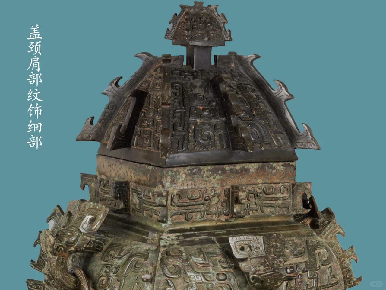 器盖,盖四面各置三条扉棱,中间扉棱稍短,四面各饰一组饕餮纹,正背面饕餮纹较大,两侧较小,饕餮纹以中部扉棱为鼻,正背面饕餮纹上部饰一组两两相对的长羽鸟纹,两侧面饕餮纹上饰一组变体饕餮纹。盖钮四面各饰一倒置牛角饕餮纹。