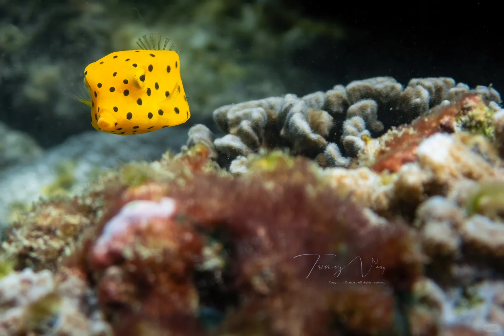 鲜黄色的“木瓜”,在长大后身体会拉长,颜色也逐渐暗淡,在蜈支洲岛水下,有时能看见大小箱鲀相伴而游的景象[色色R]