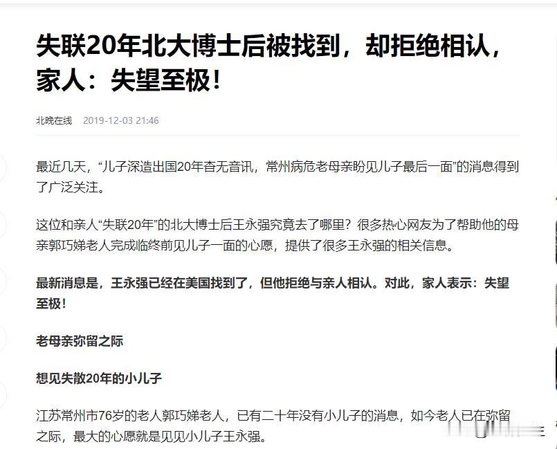 (来源:北晚在线2019-12-3《失联20年北大博士后被找到,却拒绝相认,家人:失望至极!》)