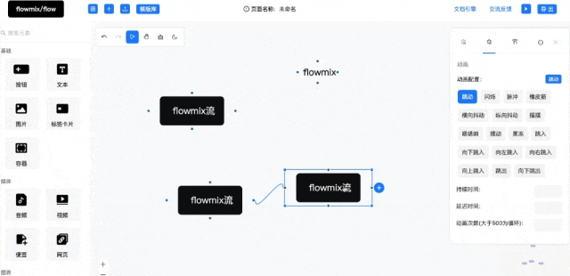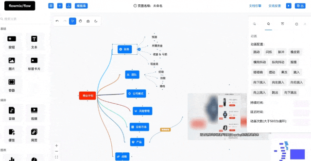 目前整套设计架构支持了多种类型的属性编辑, 比如样式, 数据, 动画等, 动画目前支持了海量的动画素材, 可以轻松给节点配置不同的动画效果, 并设置动画的时长, 次数等.