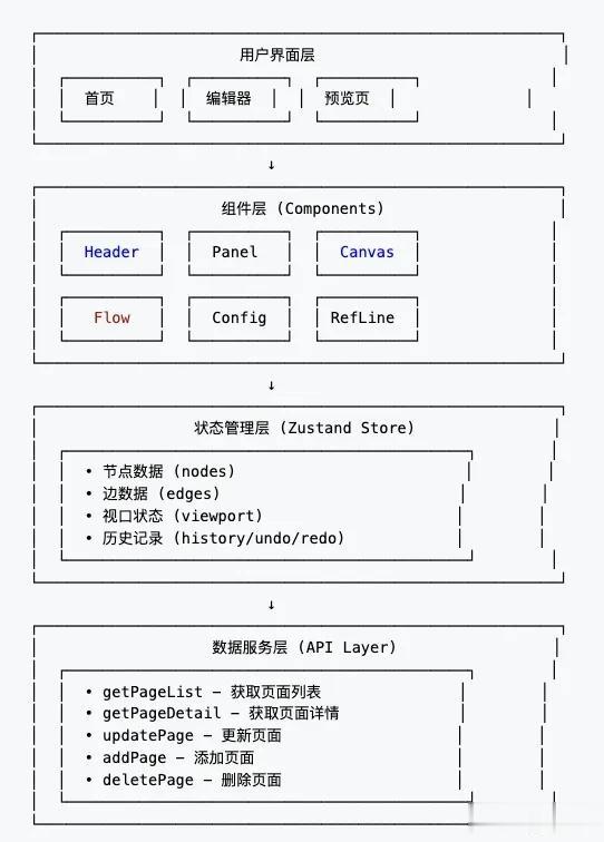 下面和大家分享一下这个项目使用的技术栈,供大家参考:Umi 4.x - 企业级前端应用框架基于 React 18内置路由、构建、部署等完整解决方案支持约定式路由和配置式路由React 18 - 前端 UI 框架使用函数式组件 + HooksSuspense 懒加载优化TypeScript 5.x - 类型安全的 JavaScript 超集提供完整的类型检查提升代码可维护性和开发体验UI 组件库Ant Design 5.x - 企业级 UI 组件库提供 Button、Drawer、Popover、Tooltip 等组件内置主题定制能力@ant-design/icons 图标库流程图核心@xyflow/react 12.x - React 流程图库提供节点、边、画布等核心能力支持拖拽、缩放、平移高性能渲染引擎@dagrejs/dagre 1.x - 有向图自动布局算法支持流程图自动排版优化节点位置计算拖拽交互react-dnd 16.x - React 拖拽库HTML5 拖拽 API 封装支持拖拽排序、拖拽创建react-dnd-html5-backend 16.x - HTML5 拖拽后端react-draggable 4.x - 元素拖拽组件支持元素自由拖拽和位置调整状态管理Zustand 4.x - 轻量级状态管理库简洁的 API 设计支持时间旅行(撤销/重做)无需 Provider 包裹可视化与图表@visactor/vchart 1.x - 可视化图表库支持多种图表类型高性能渲染工具库nanoid 5.x - 唯一 ID 生成器小巧、安全、快速用于节点和边的 ID 生成axios 1.x - HTTP 客户端用于 API 请求支持请求/响应拦截classnames 2.x - CSS 类名管理条件类名组合immutability-helper 3.x - 不可变数据操作简化复杂数据结构更新react-use 17.x - React Hooks 工具集提供常用 Hooksreact-sticky-box 2.x - 粘性定位组件refline.js 0.11.x - 参考线组件提供辅助对齐功能导出功能dom-to-image 2.x - DOM 转图片支持导出流程图为图片file-saver 2.x - 文件下载支持保存文件到本地核心功能介绍