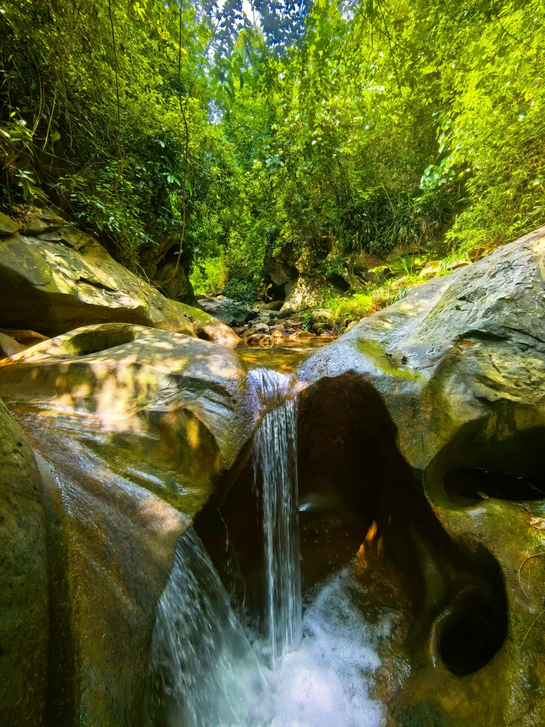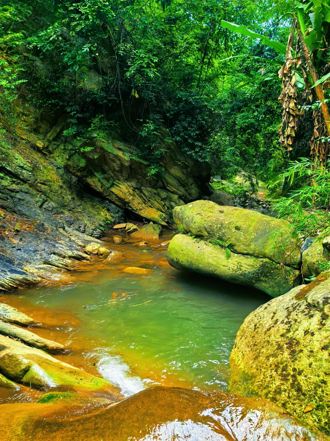 前星村是最近两年重庆最火的溯溪线路,标志性的玻璃水确实很绝。但是如果你更喜欢雨林溯溪的原始感,那这条线路更适合你!线路由高低多个水潭加岩壁组成,需要沿着岩壁上的小坑从下向上爬,多个水潭深度达到两米以上,水质冰凉透彻,非常舒服。茂密的雨林包裹,极具原始美感!