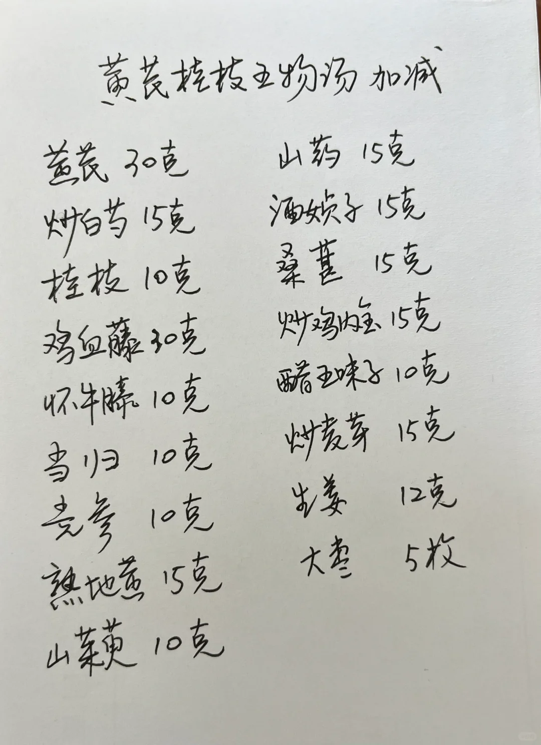 黄芪、白芍、桂枝、鸡血藤、怀牛膝、当归、党参、生姜、大枣。