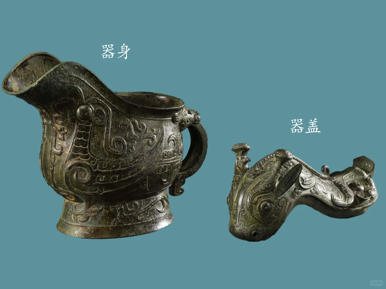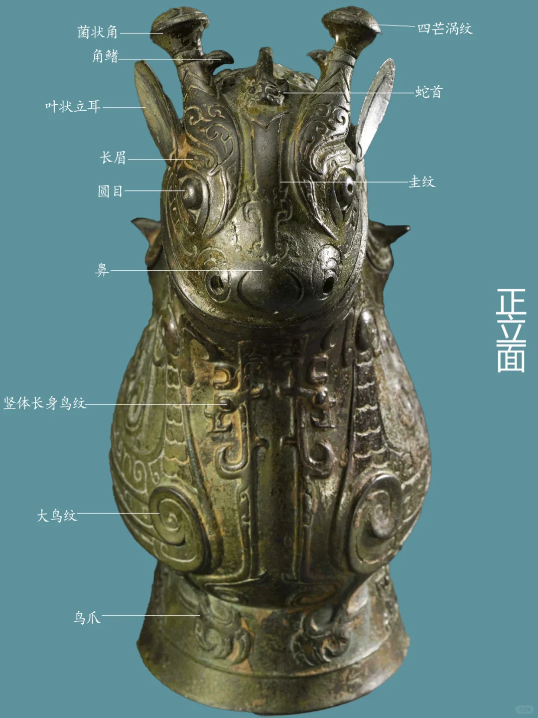 盖首端为一兽首面,圆雕兽角似蜗牛触角,上饰阴线云纹与两周曲折纹,角顶部饰阴线四芒涡纹;首额部饰阴线长圭纹;圆雕兽耳,内饰阴线;眉、目、口为高浮雕,圆状下颚;直眉,眉面饰阳线竖条示毛眉,凸圆目中间一横向凹窝;鼻、须等以阴线饰。首顶正中饰一圆雕蛇首,以盖身扉脊为身,扉脊末端出圆雕蛇卷尾;盖身饰一组大鸟纹,以兽首扉脊为界。盖尾部亦饰一饕餮纹雕饰,圆雕兽角外扬,角面饰阴线卷云纹,饕餮圆面,叶形横耳,粗眉圆目,嘴角内卷,鼻前端向前凸起;盖尾部出圆雕兽尾示器盖部兽尾,兽尾面饰阴线蝉纹。腹部前后两面各饰一大鸟纹,大鸟身后部上饰一幼鸟纹;其后置半环鋬,鋬首饰圆雕,勾形垂珥,鋬面饰四组阴线卷云纹,觥正腹部下饰两组倒置的长身卷尾鸟纹 。圈足正背面各饰遗址长身卷尾鸟纹。