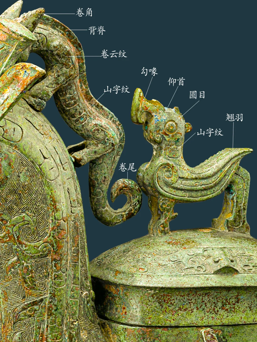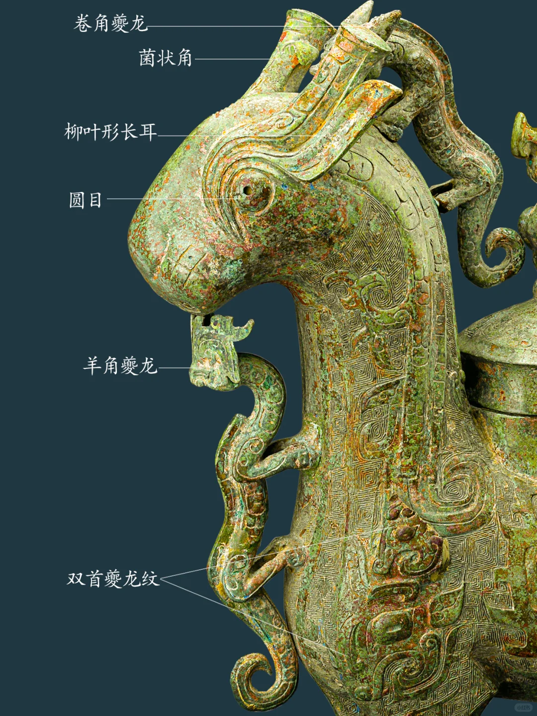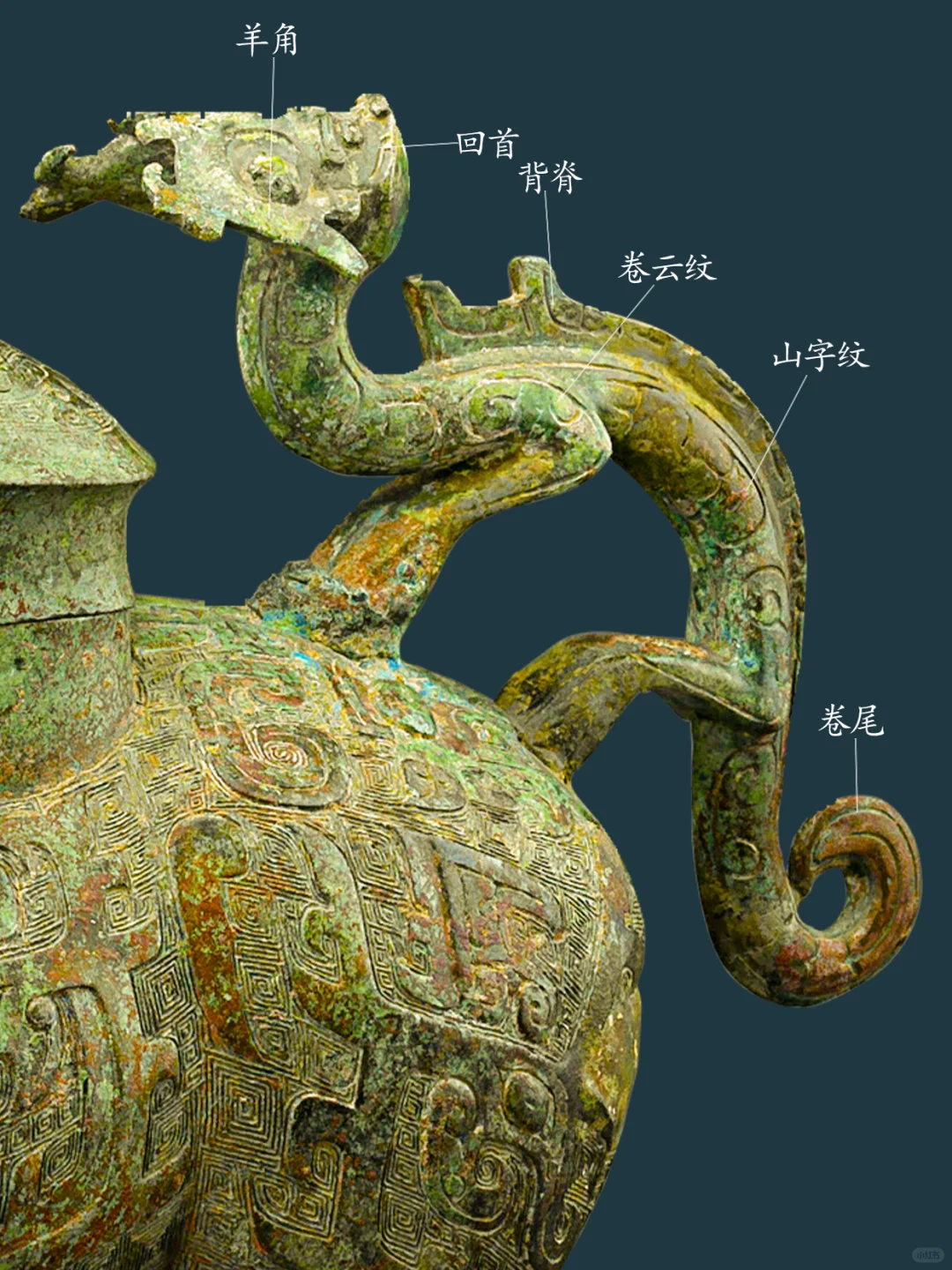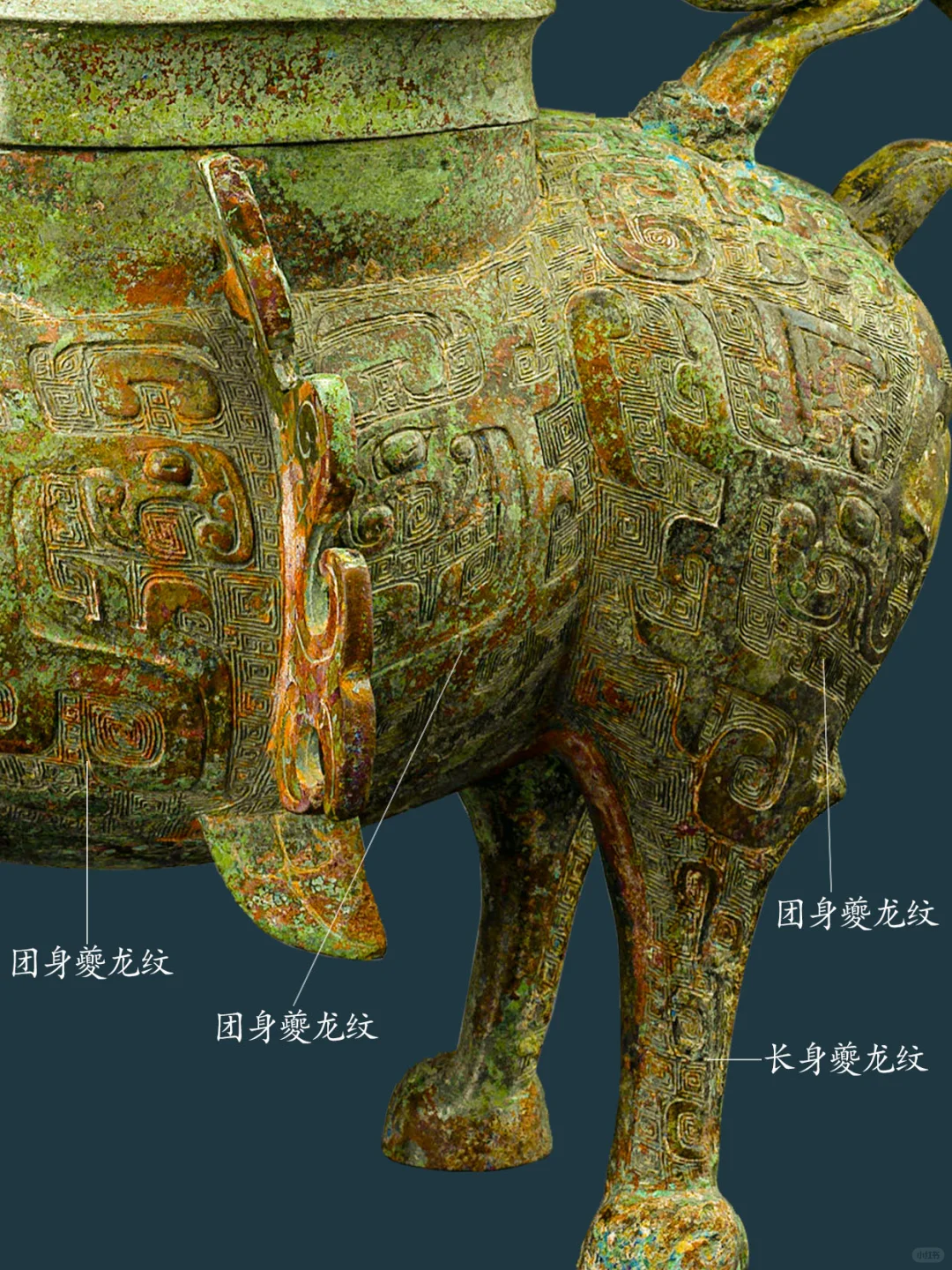 牺尊主体为鹿形,兽首前瞻,顶有菌状双角,角内侧有一弯曲上翘小叉,柳叶形长竖耳。兽鼻隆起,腿短而粗壮,短尾呈三角形。兽腹两侧各有一鸟形竖脊,脊下有三角形小鳍。 牺尊背部有圆盖,盖纽为圆雕立鸟,项背置一圆雕卷角卷尾夔龙,作爬行回首状。胸前置一 圆雕羊角卷尾夔龙,作攀爬状。臀部上置一 圆雕羊角卷尾夔龙,作站姿回首状。