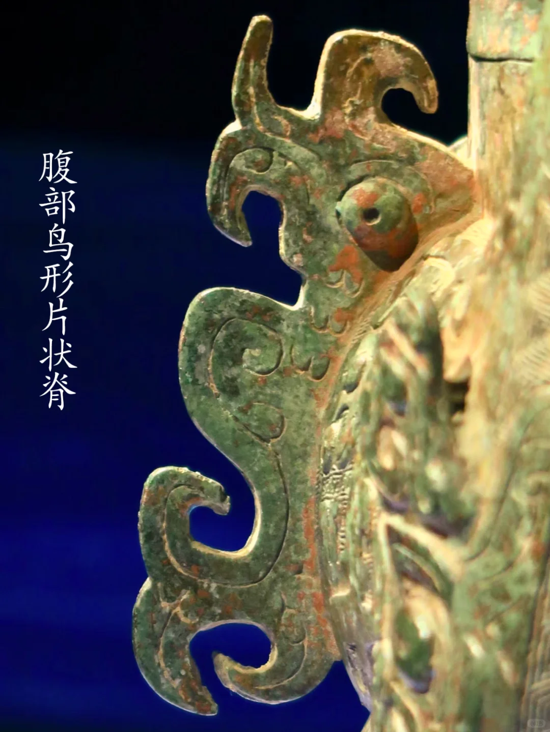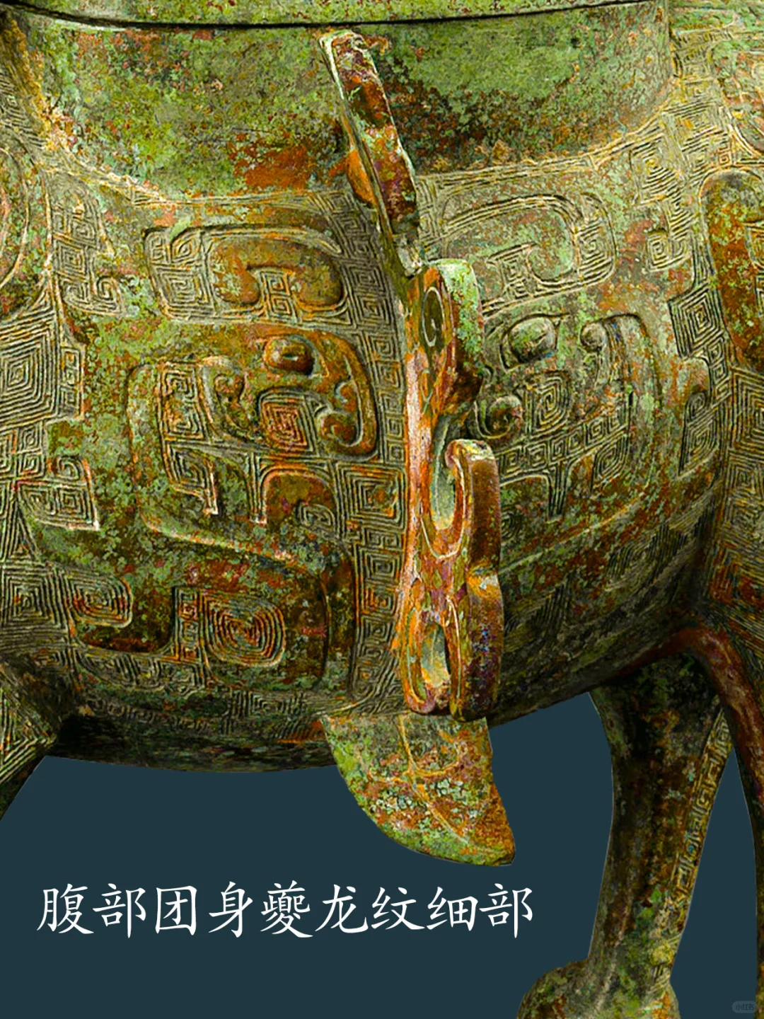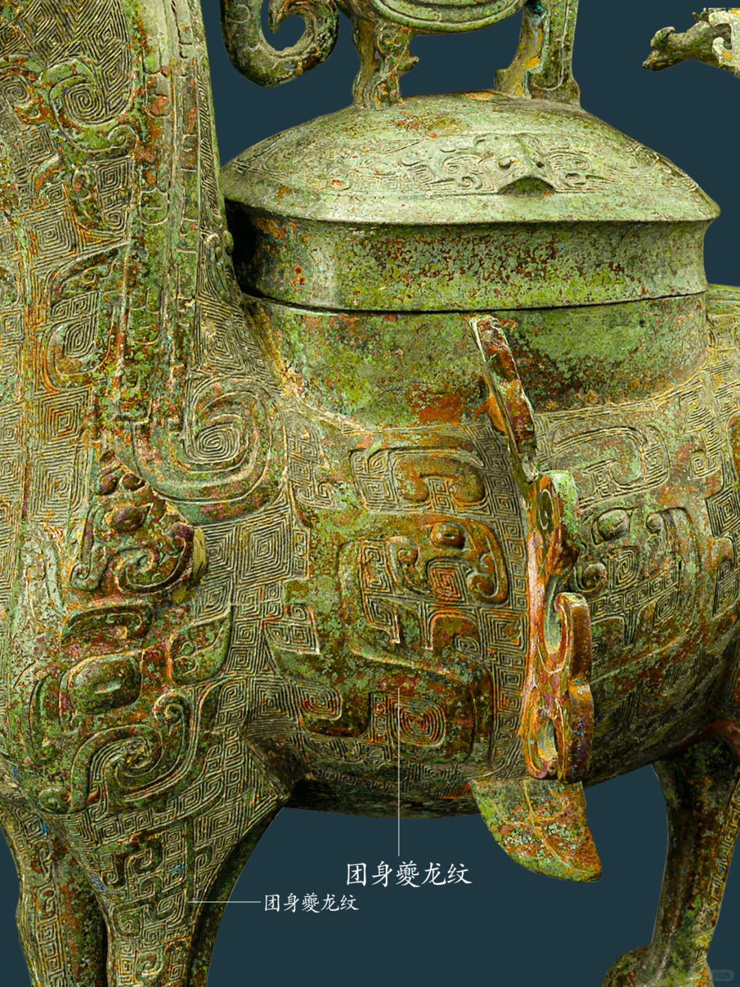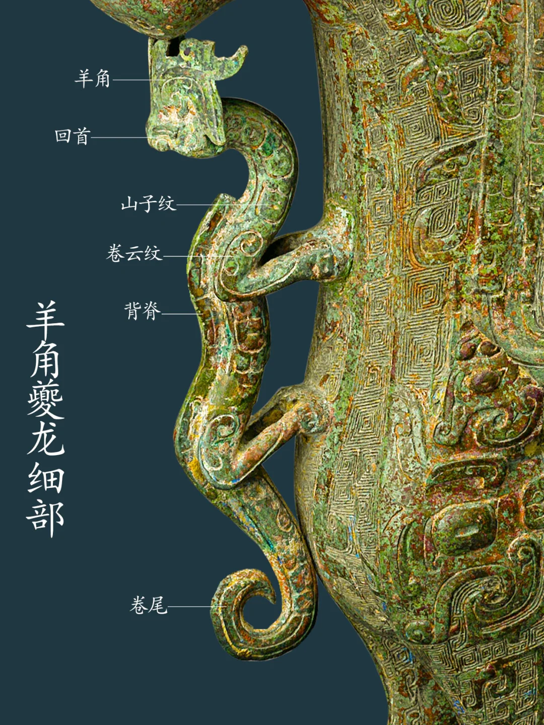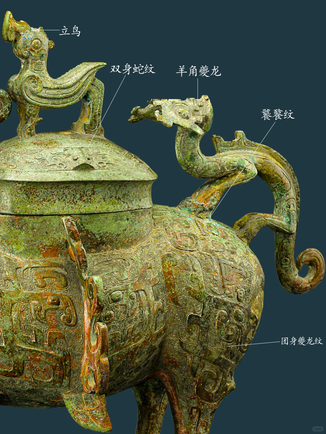 牺尊主体为鹿形,兽首前瞻,顶有菌状双角,角内侧有一弯曲上翘小叉,柳叶形长竖耳。兽鼻隆起,腿短而粗壮,短尾呈三角形。兽腹两侧各有一鸟形竖脊,脊下有三角形小鳍。 牺尊背部有圆盖,盖纽为圆雕立鸟,项背置一圆雕卷角卷尾夔龙,作爬行回首状。胸前置一 圆雕羊角卷尾夔龙,作攀爬状。臀部上置一 圆雕羊角卷尾夔龙,作站姿回首状。