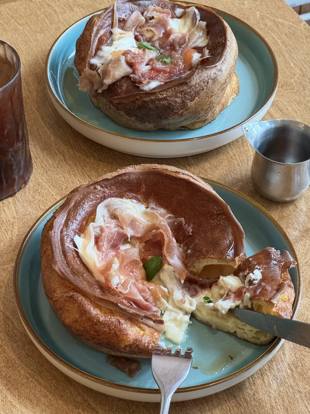 咸口的火腿和奶酪配上白桃酱再加一点枫糖浆 咸甜搭配就是无敌的存在!!松饼外脆里嫩!!好好吃🤤