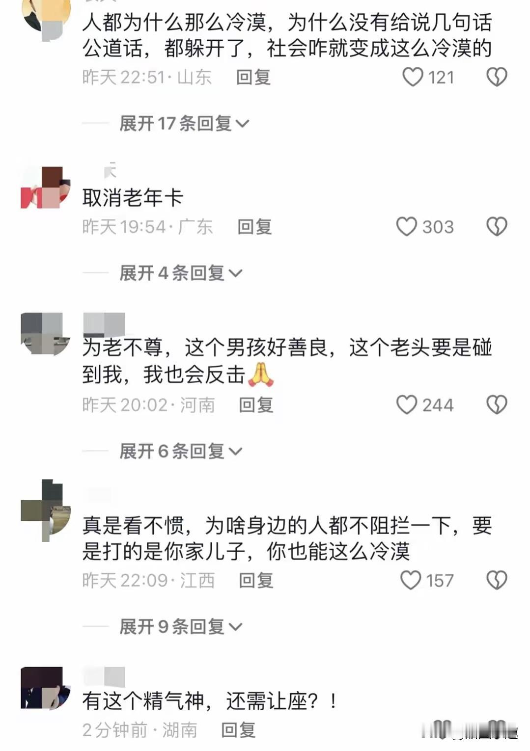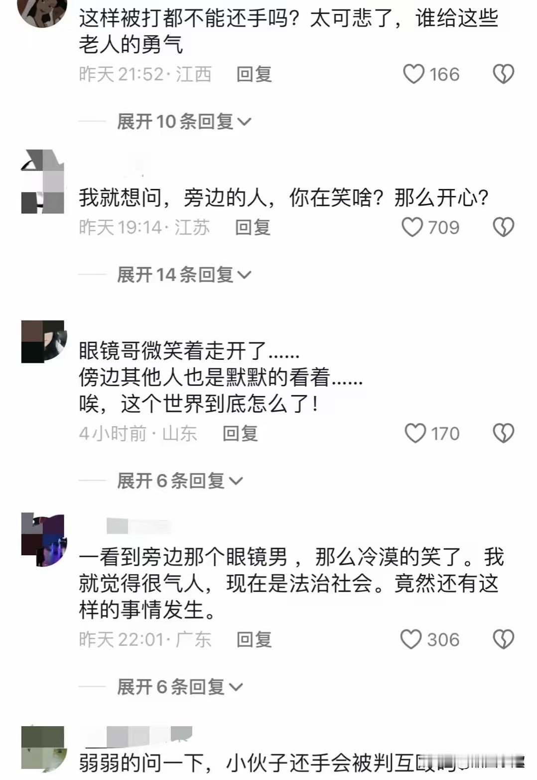 青岛地铁老人殴打小伙,口鼻流血不敢还手,最新通报来了。 就在最近,一段“老人暴揍拒绝让座的年轻小伙”的视频在网络上疯传开了,那小伙全程被打口鼻流血不敢还手,看到这场景不禁令人心生疑惑,他为啥不敢还手呢?网友炸锅了 我看了这个视频,这个老人非常霸道、凶狠且无礼,法律绝对不要轻易放过这个老恶棍!必须严惩到让他后悔从娘胎里出来。#青岛老人打年轻人##青岛身边事##青岛打人事件最新进展##遏制体育界饭圈乱象刻不容缓# 这样被打都不能还手吗?太可悲了,谁给这些老人的勇气。 我就想问,旁边的人,你在笑啥?那么开心。 严查老人身份取消老人的养老金和公交车。 一看到旁边那个眼镜男 ,那么冷漠的笑了。我就觉得很气人,现在是法治社会。竟然还有这样的事情发生。 弱弱的问一下,小伙子还手会被判互殴吗? 是坏人变老了?还是老了变坏了,我们年轻人还能不能正当防卫,对于这件事大家有什么想说的,评论区留言把
