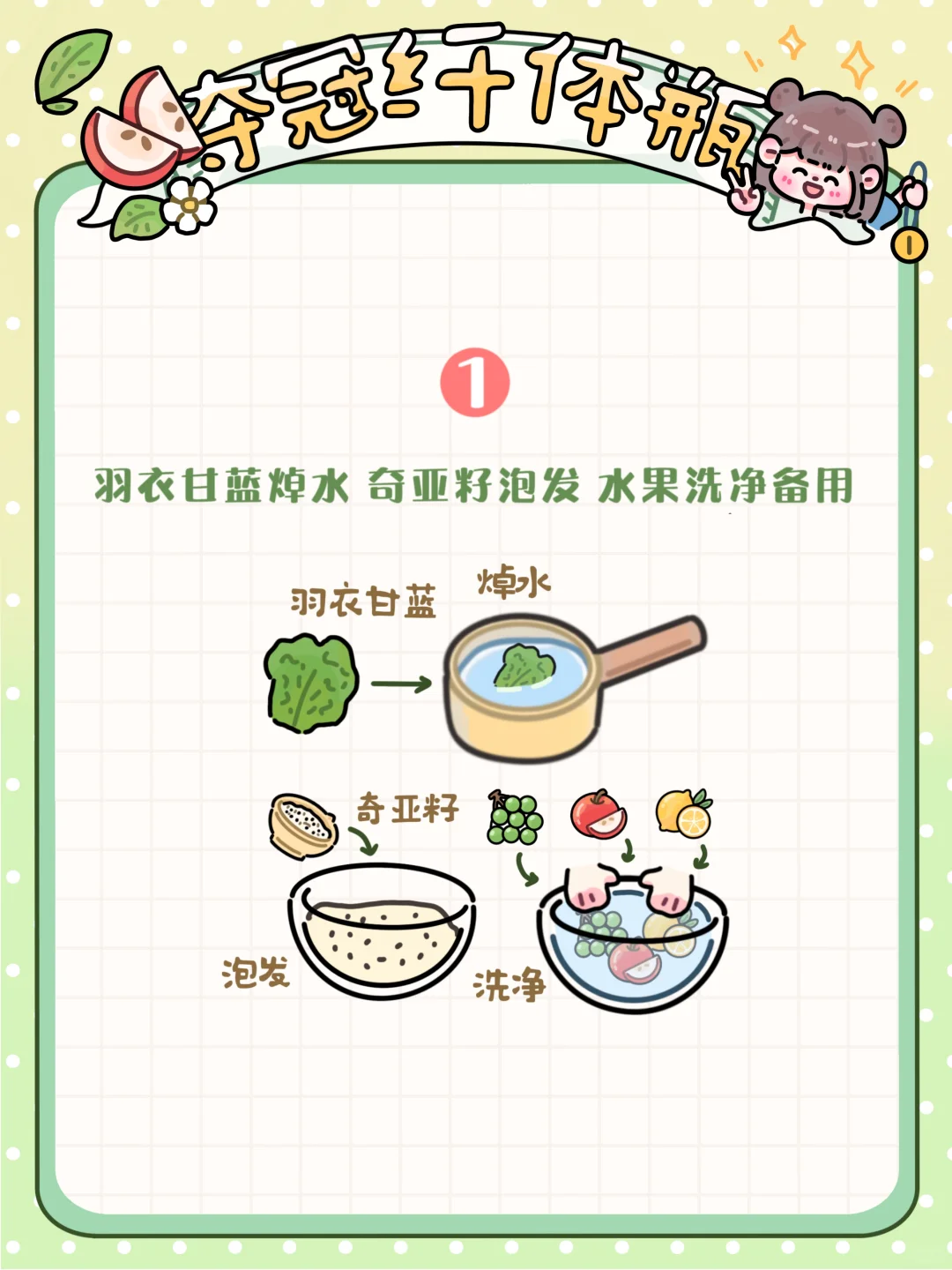 1⃣羽衣甘蓝焯水,奇亚籽泡发,其他水果洗净备用
