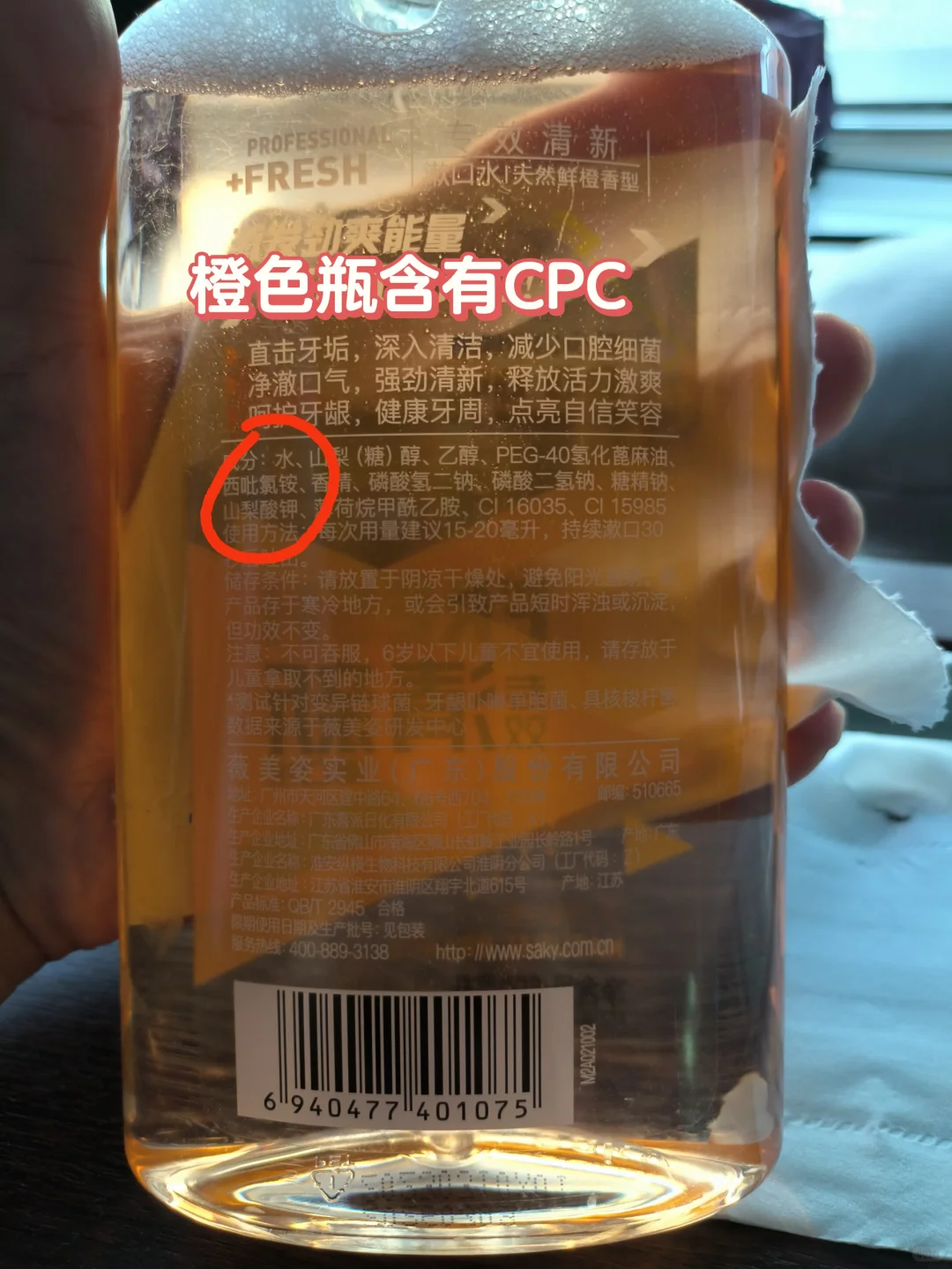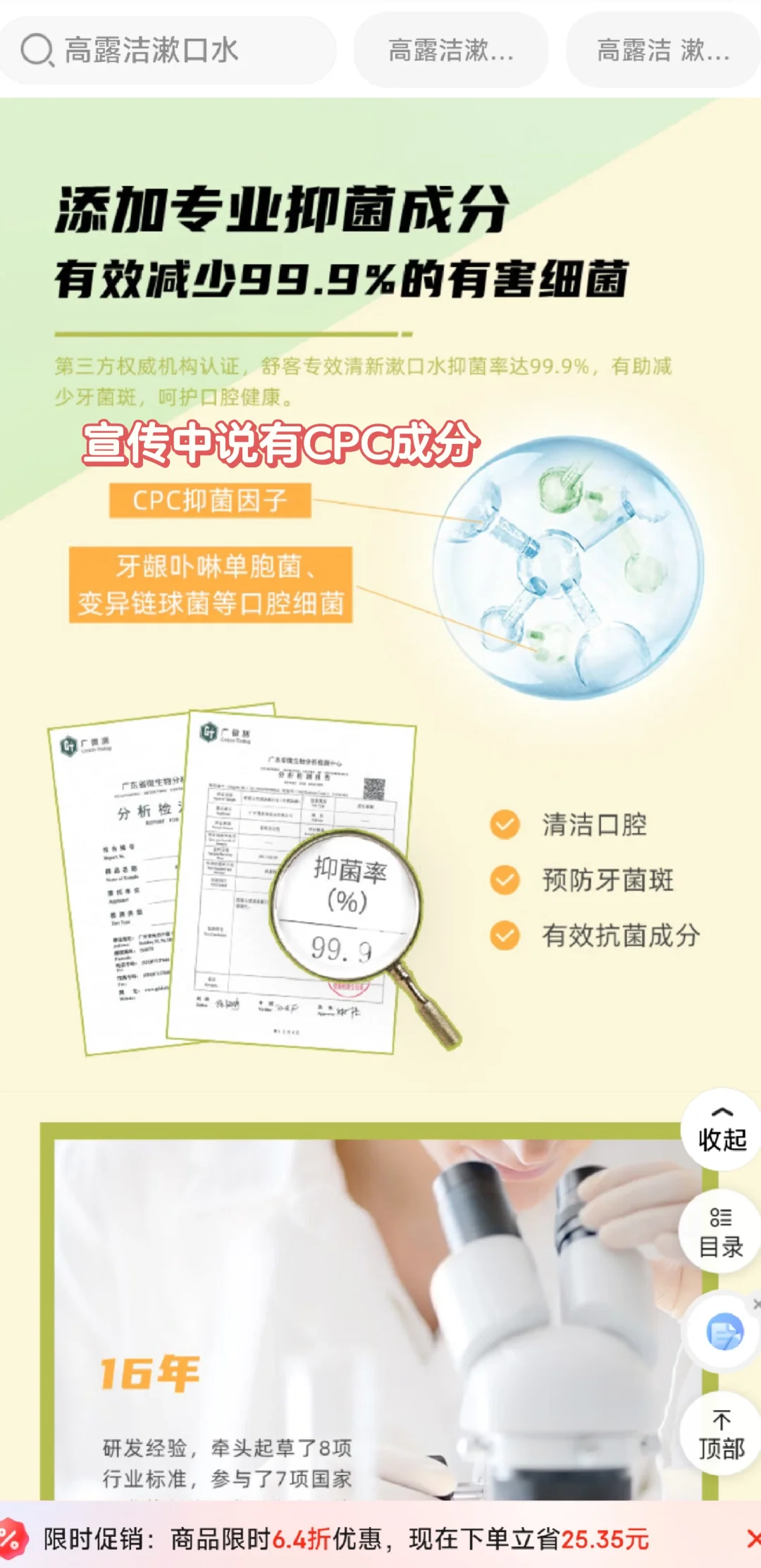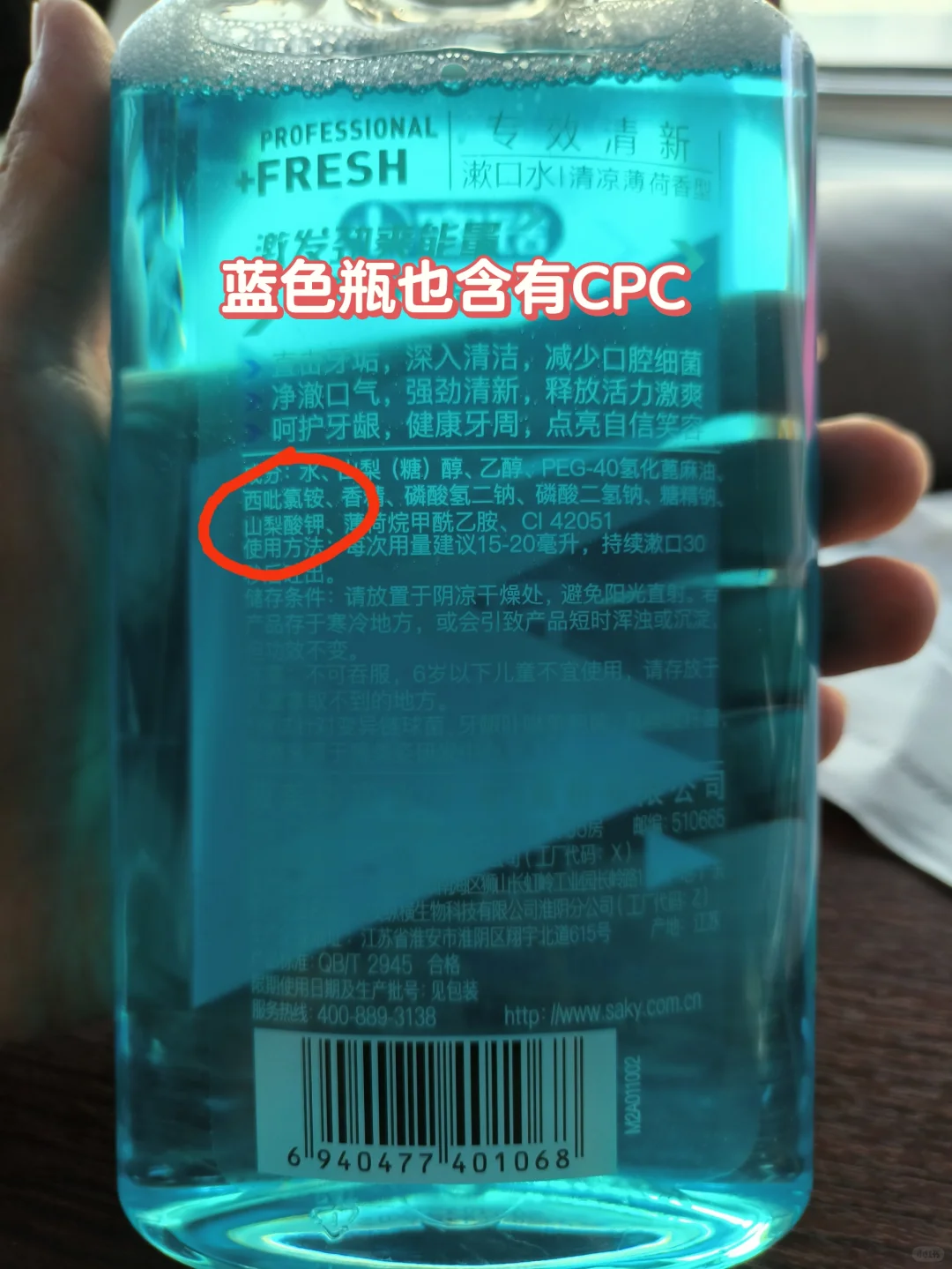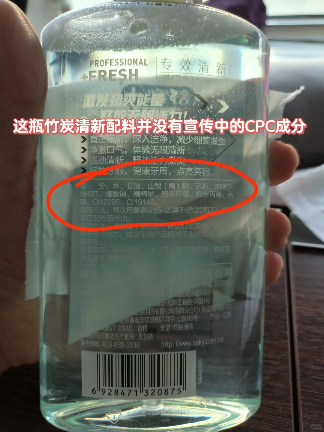 [皱眉R]真是大意了,买舒克专效清新漱口水,看宣传页面含有CPC抑菌成分,马上下单了。 [失望R]本来以为三种漱口水配料都一样,结果仔细一看,竹炭清新这瓶子根本没有CPC成分!其他两瓶有!那我就怀疑了,这瓶没有CPC成分的漱口水抑菌99.9%的报告是怎么出来的?!怎么跟宣传不符呢?! [生气R]为什么要吐槽这个牌子呢?因为用过高露洁,佳洁士,好来的漱口水,专门买含有CPC成分的,虽然他们口味不同,但是每个口味都含有CPC的!