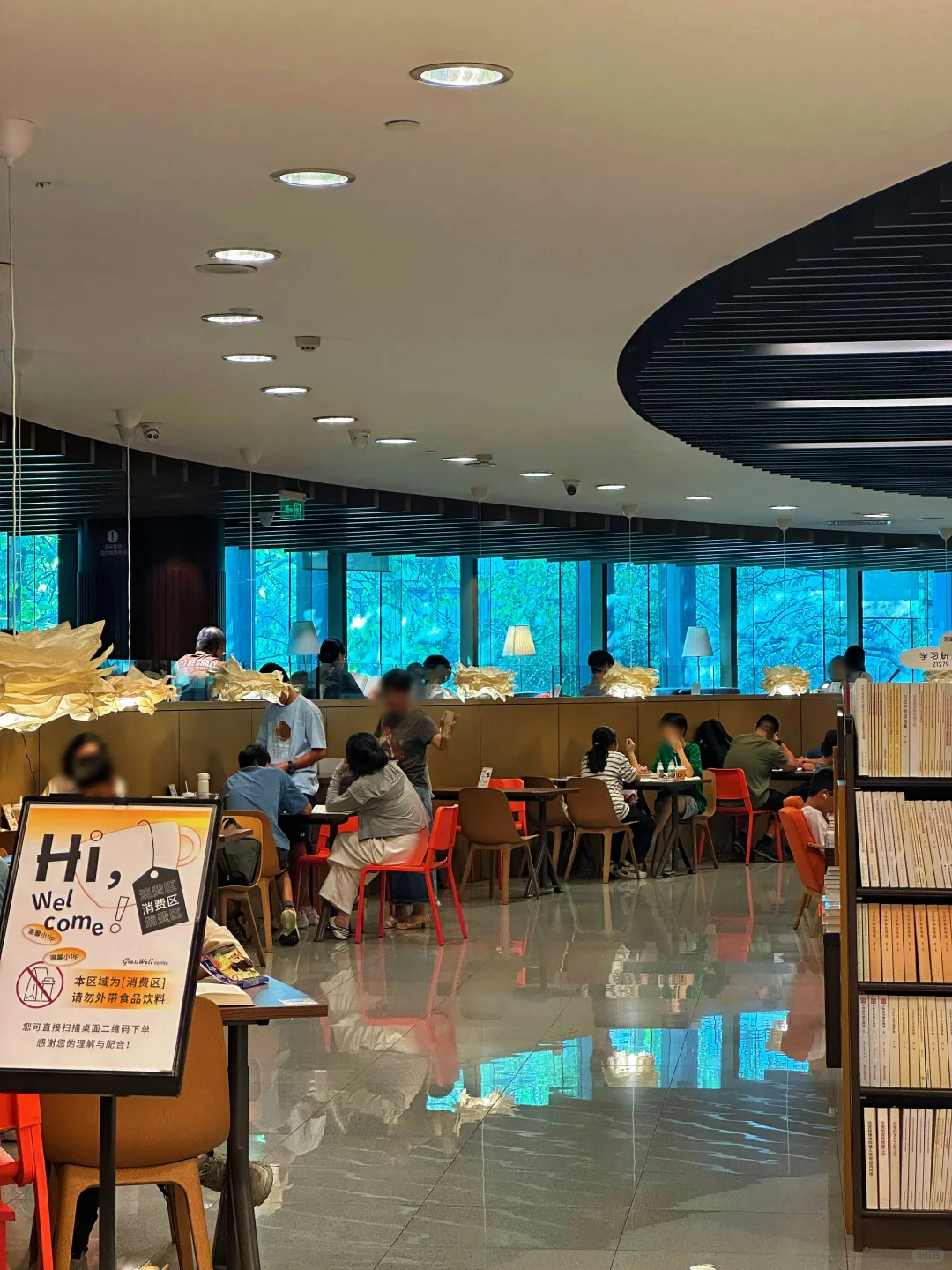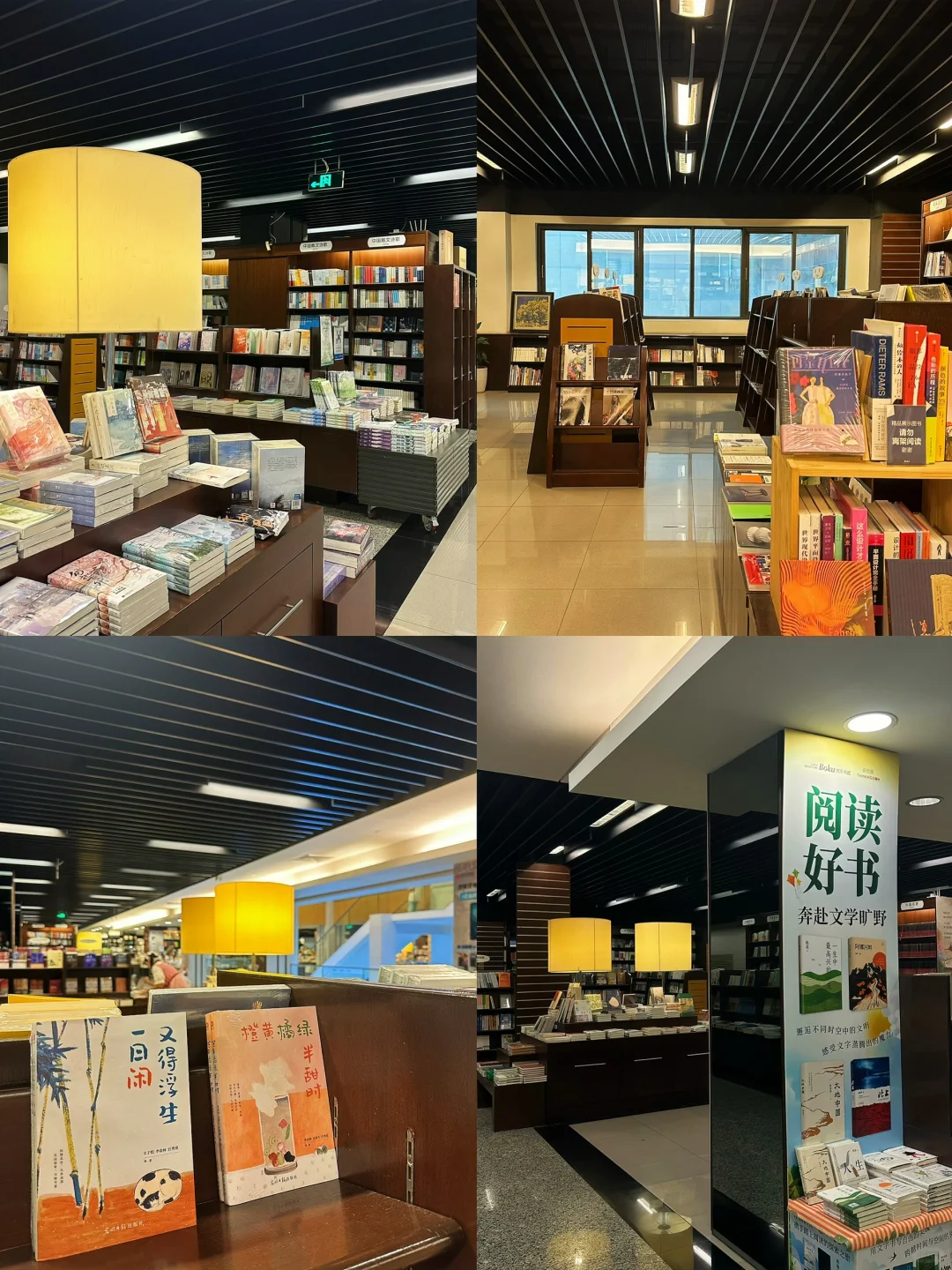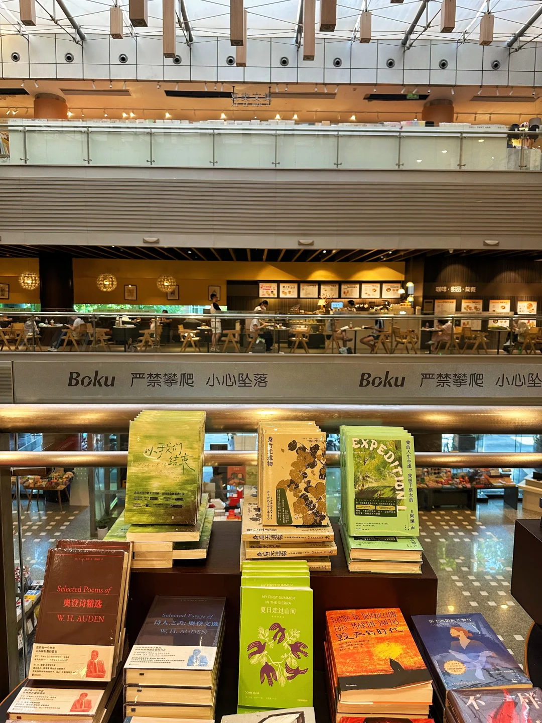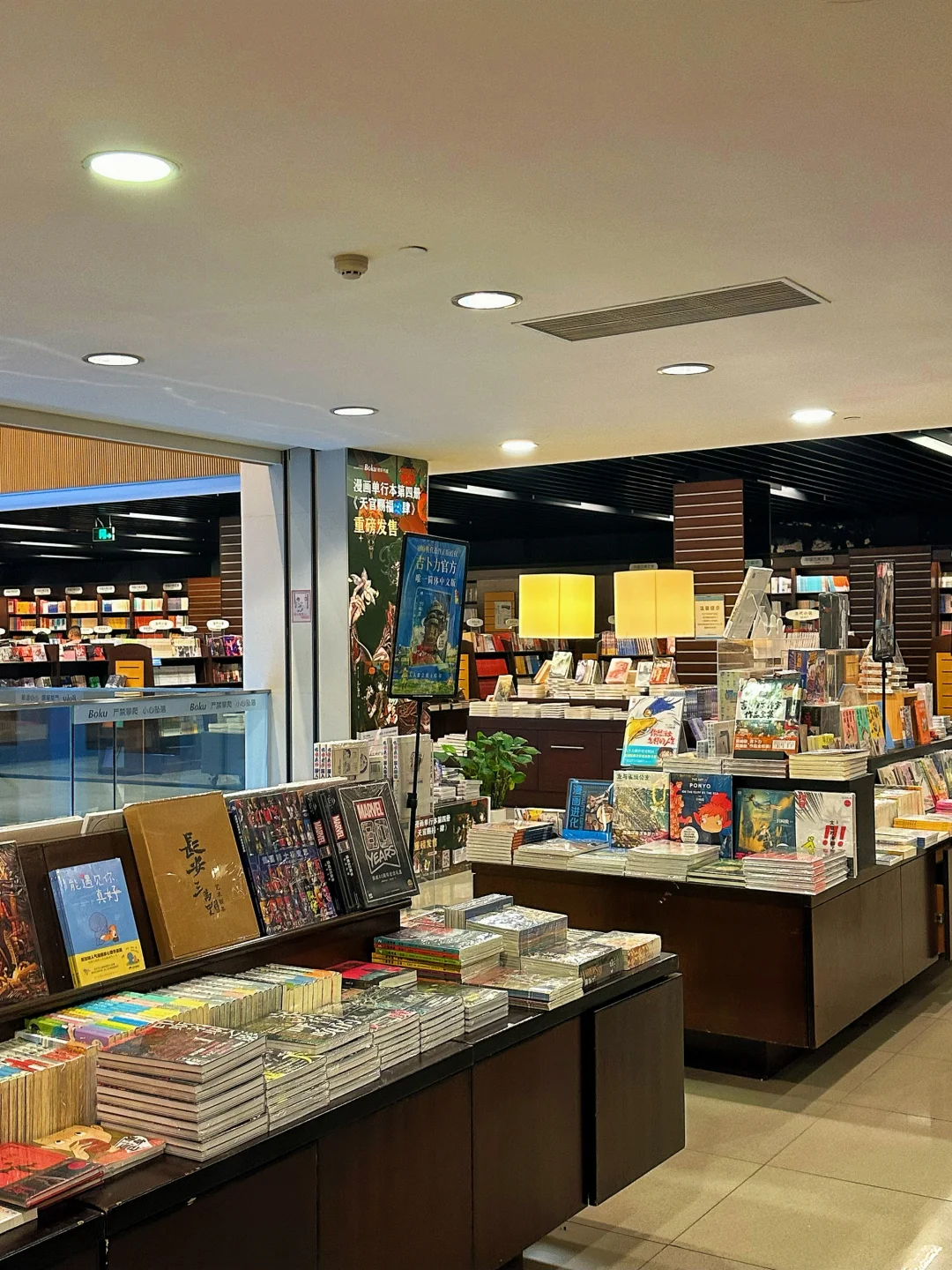 🍃书城很大,装修环境优雅,很适合阅读和办公,一共有三层。一楼是热销书籍和一些文创;二楼有餐吧和落座区,落地窗边的位置都是需要消费落座的,餐吧提供咖啡☕️、甜品🍧和简餐🍝。二楼书籍类目很丰富,特别是文化历史、经济金融、法律政治、文学小说等;三楼是儿童书籍和辅导书籍,很适合家长带孩子来看书。
